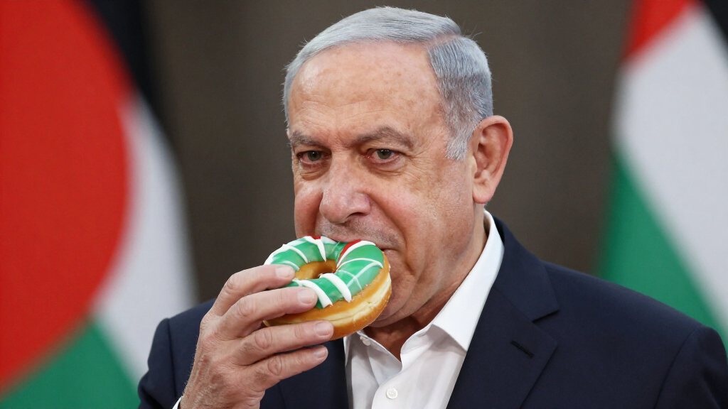 Netanyahou joyeux qui mange un gros donut appétissant au couleur du drapeau palestiniens