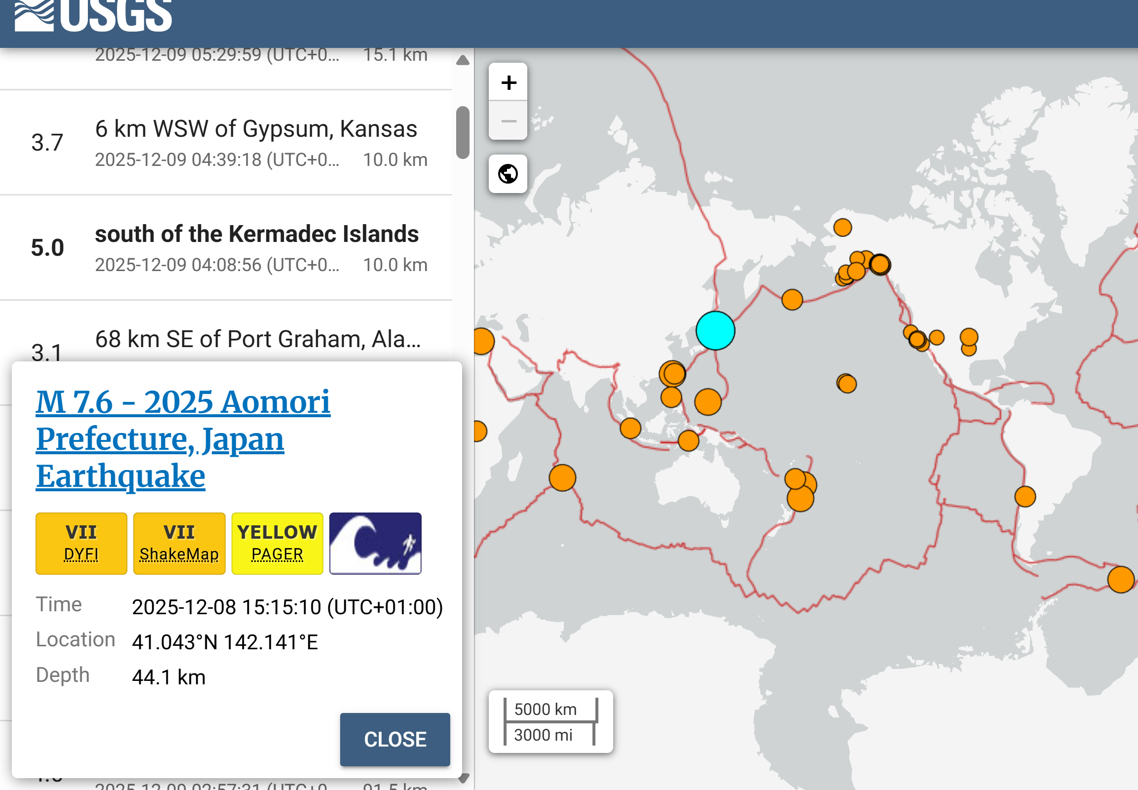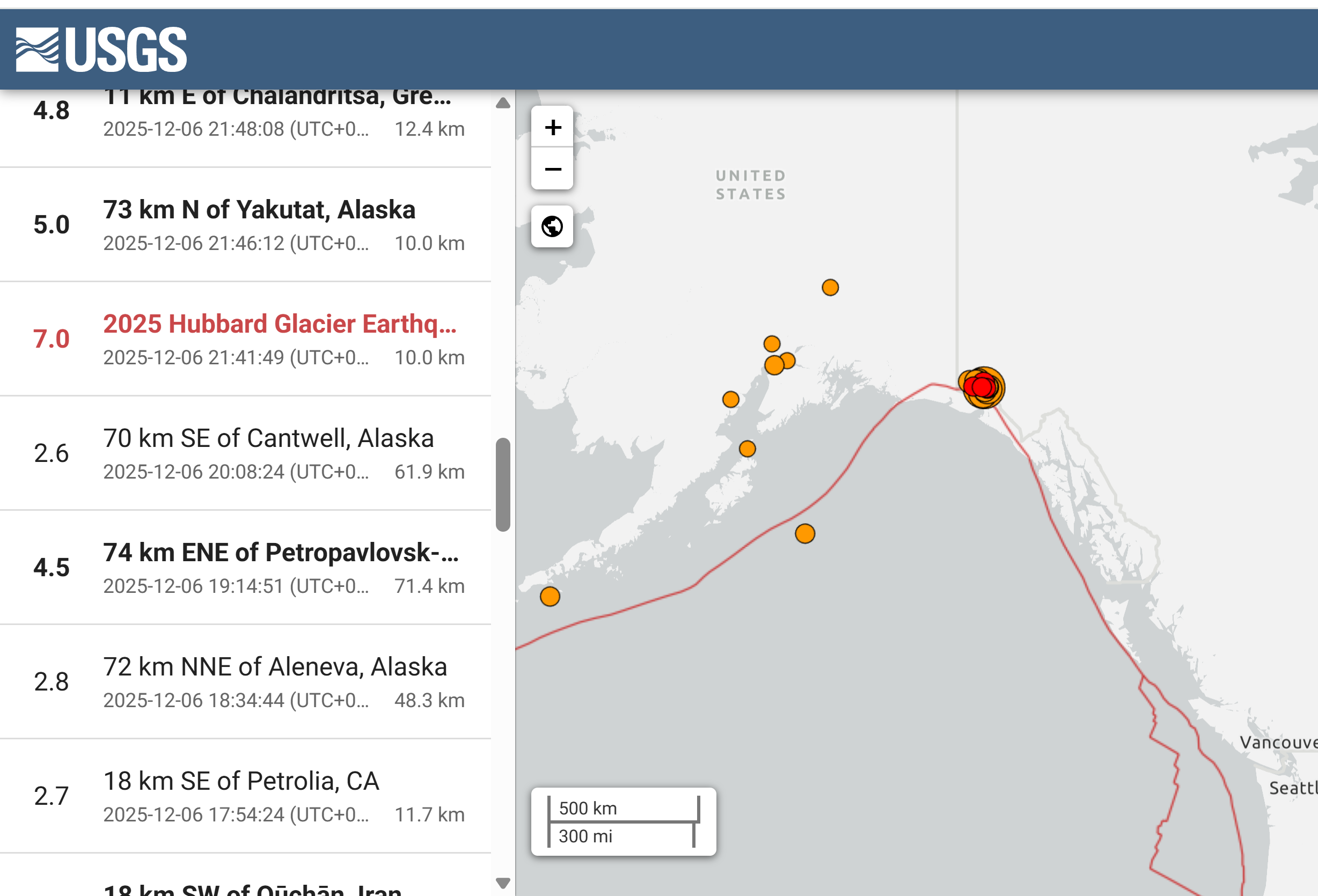 mais 2 seismes de tres forte magnitude sur la meme faille d'un bout a l'autre du Pacifique en moins de 2 jours (6dec a 21h et 8decembre a 15h) c'est assez etonnant