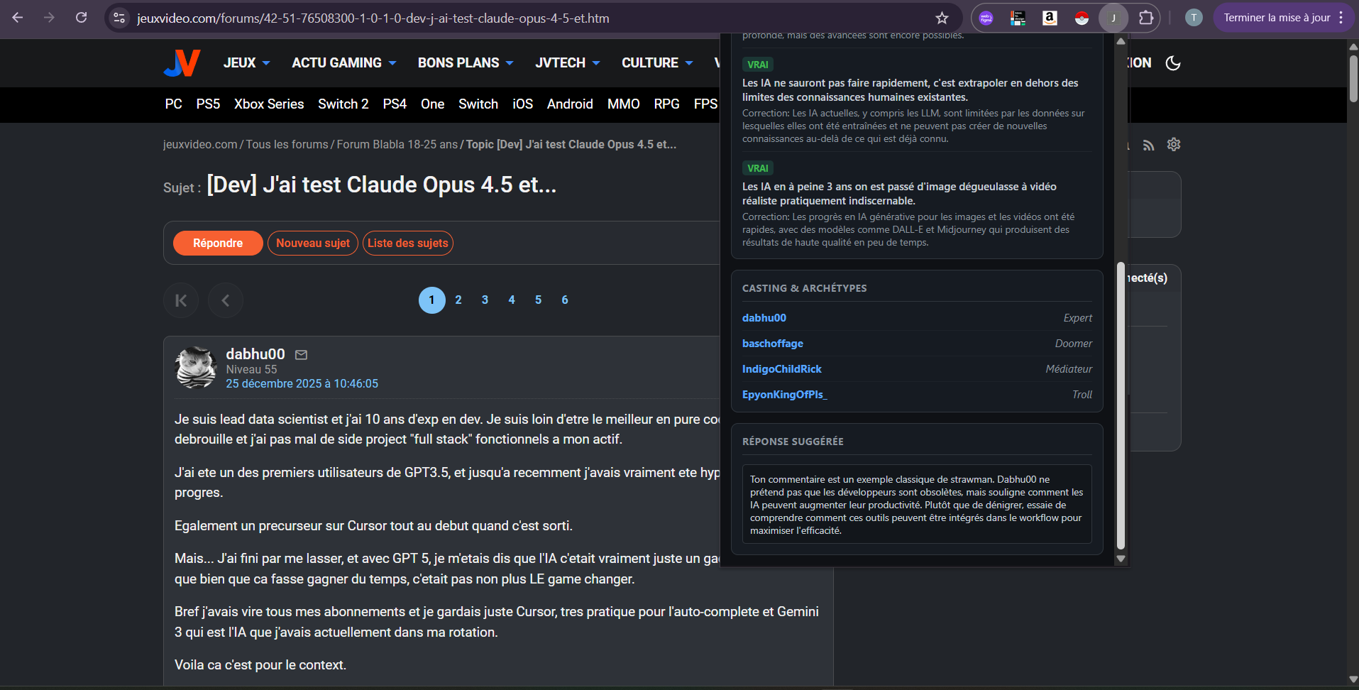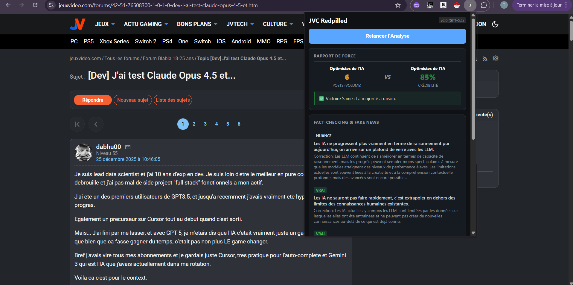 Aussi j'ai l'impression que GPT 5.2 est plus pertinent que Claude effectivement actuellement. Sur plusieurs choix de designs, j'ai confrontés les 2 sur des idées d'implémentations et Claude reconnaissait les idées de GPT comme meilleures (et moi aussi)