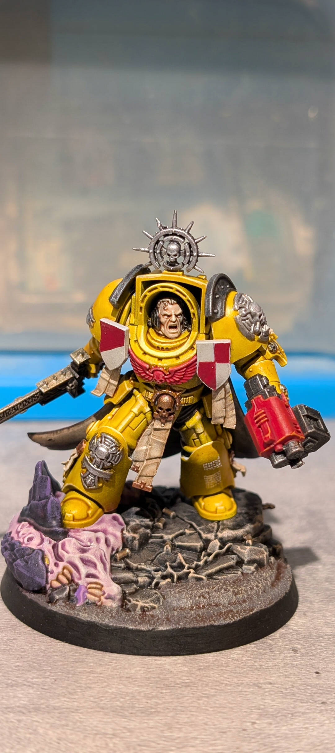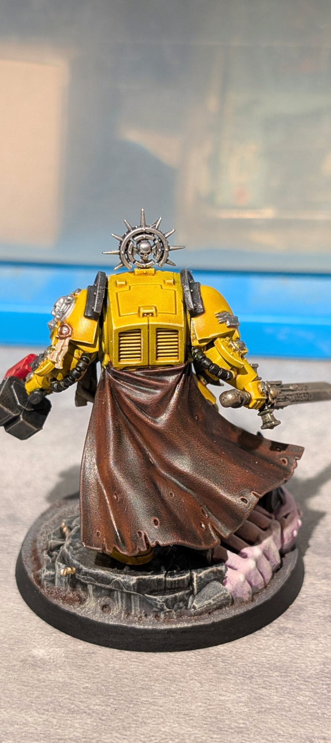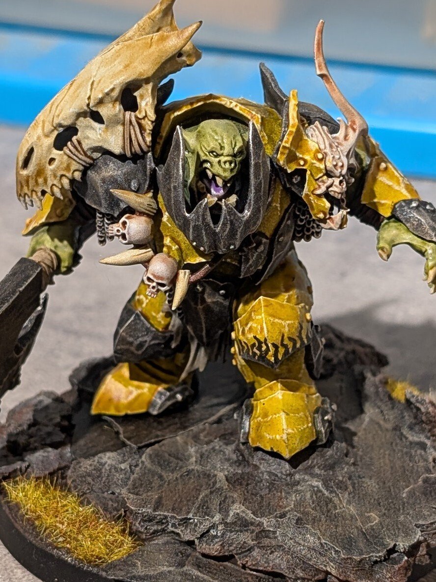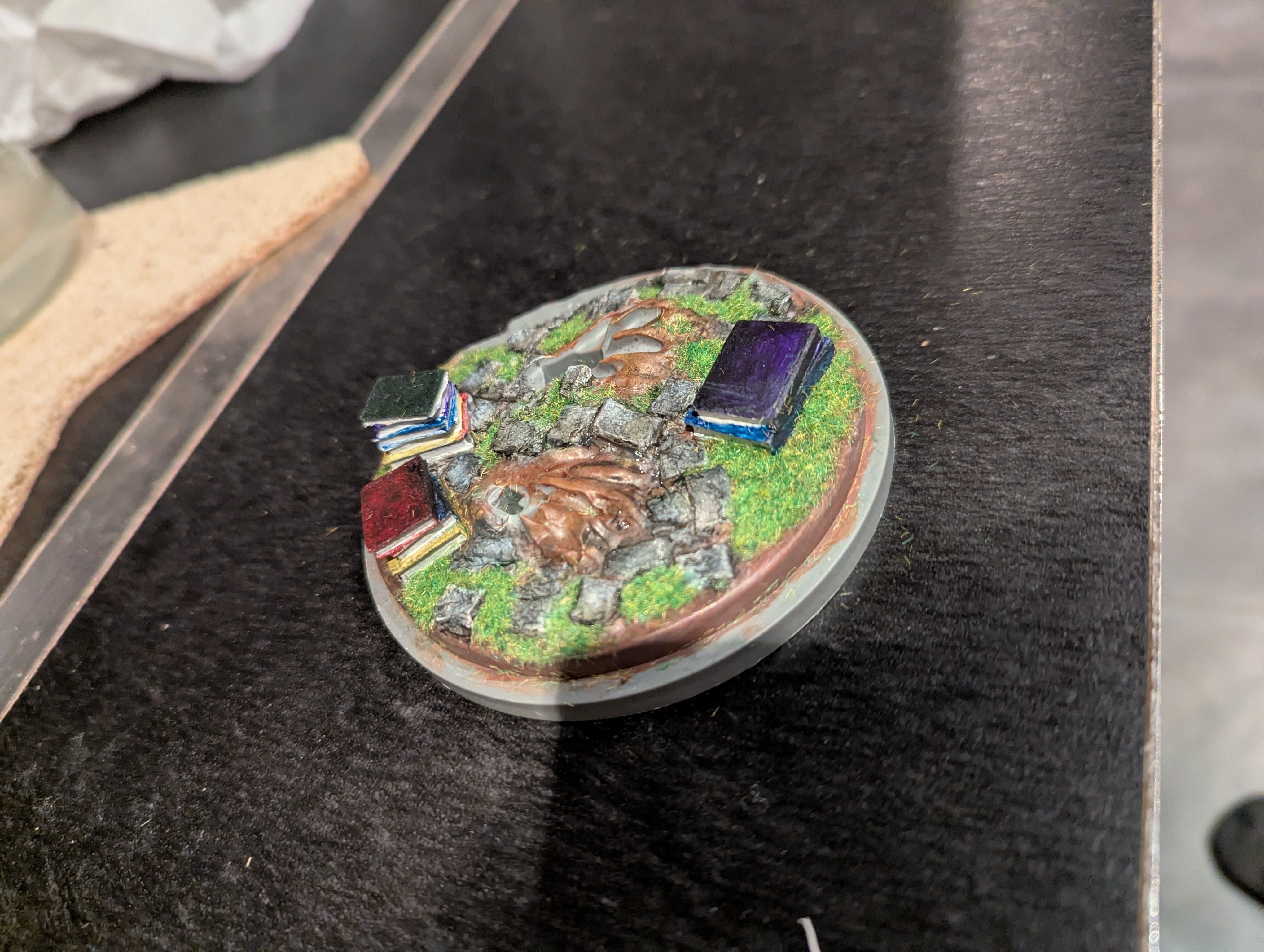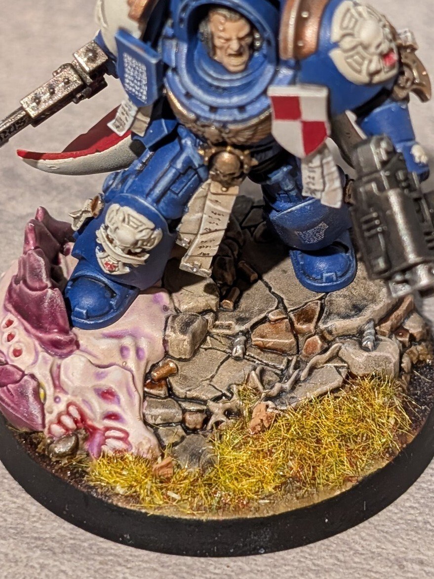 Encore une fois, y a pas de mystère, il faut investir un minimum. Chaque pot citadel c'est 3,60. 5 ou 6 pots différents suffisent souvent pour faire une figurine. En plus on peut mélanger la peinture. Les pinceaux c'est 4 balles, et la sous couche, si tu ne veux pas dépenser 25 balles, tu peints 3 couches très diluées de noir sur l'intégralité de la figurine. Moi j'adore le noir, les couleurs gagnent vraiment en profondeur.Je te montre quelques bases qui ont des détails comme la tienne pour te montrer grosso modo ce que tu dois arriver à faire.