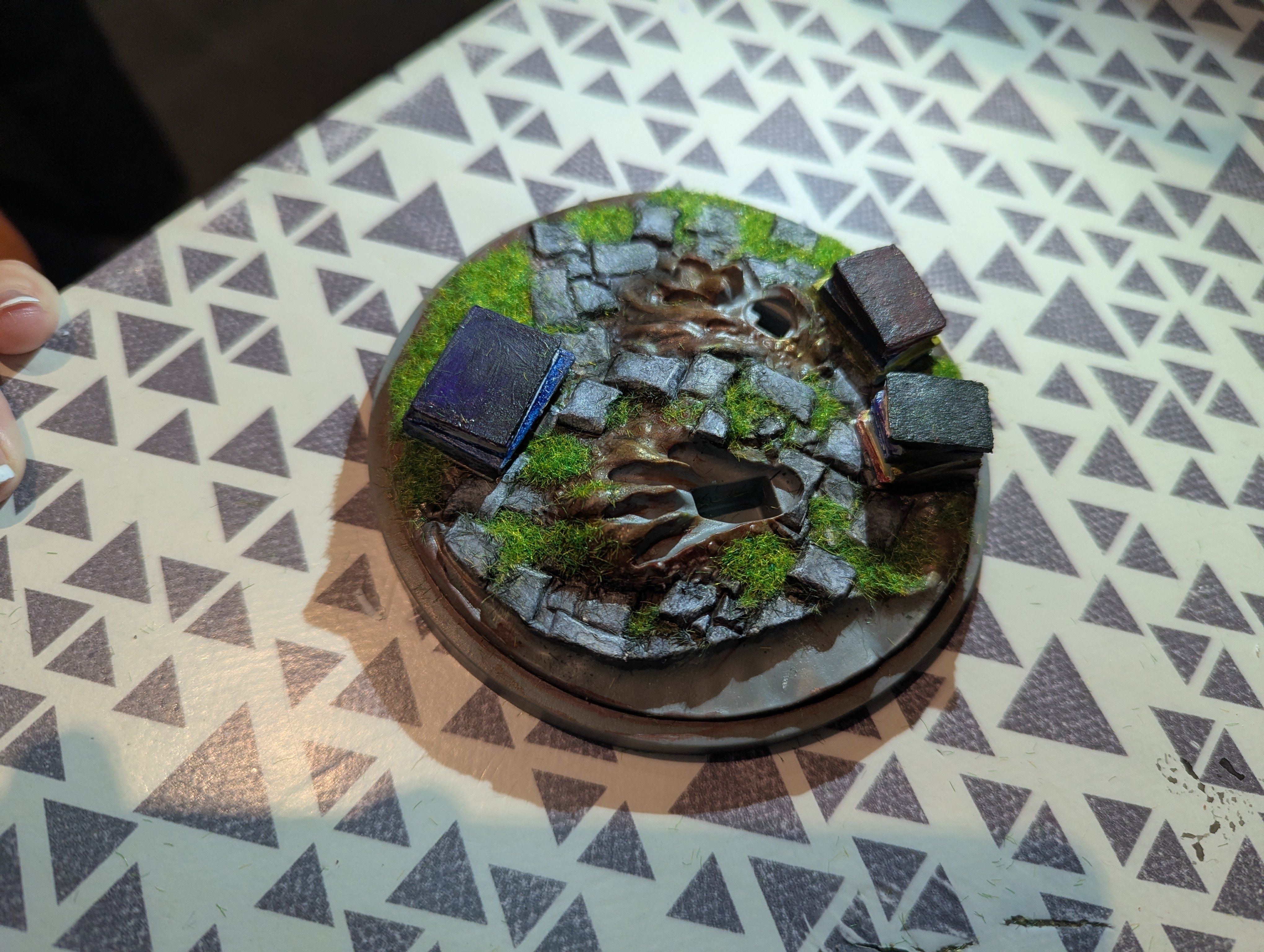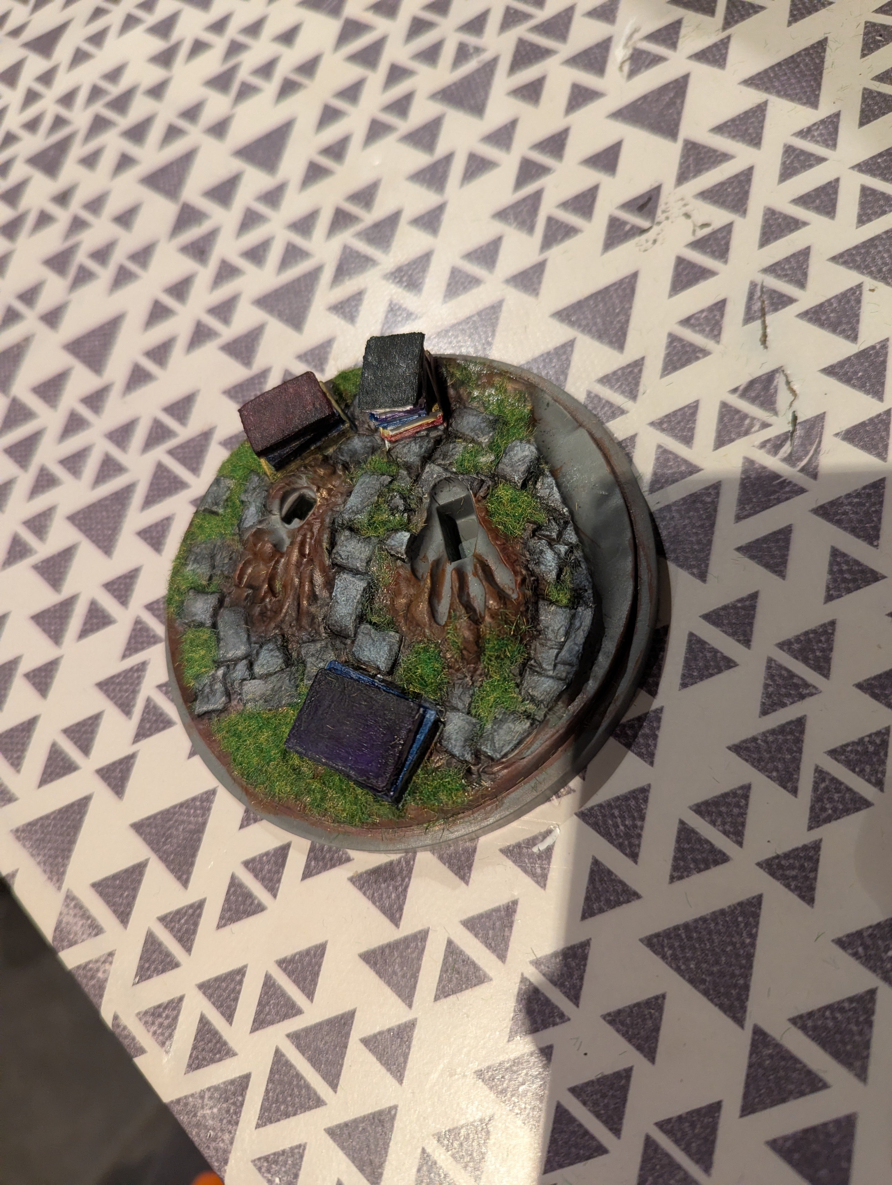 Oui, zone de creux. Je pense que l'eau doit diluer la peinture. Encore une fois je ne sais pas vraiment ce que tu utilises, peut être une peinture qui n'est pas adaptée au plastique. Si tu as collé l'herbe deja, je te suggère de peindre la tranche des pierre pour la rendre gris foncé.