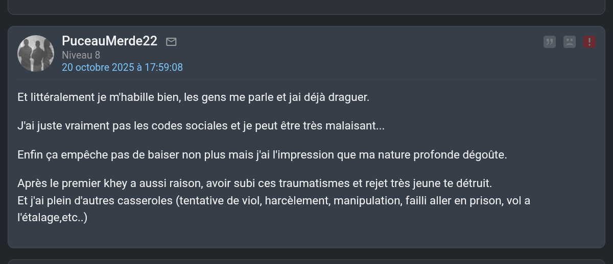 se présente comme un sain qui n'a jamais rien fait de mal et accuse les femmes de le rejeter pour "rien" mais quand on creuse un peu...