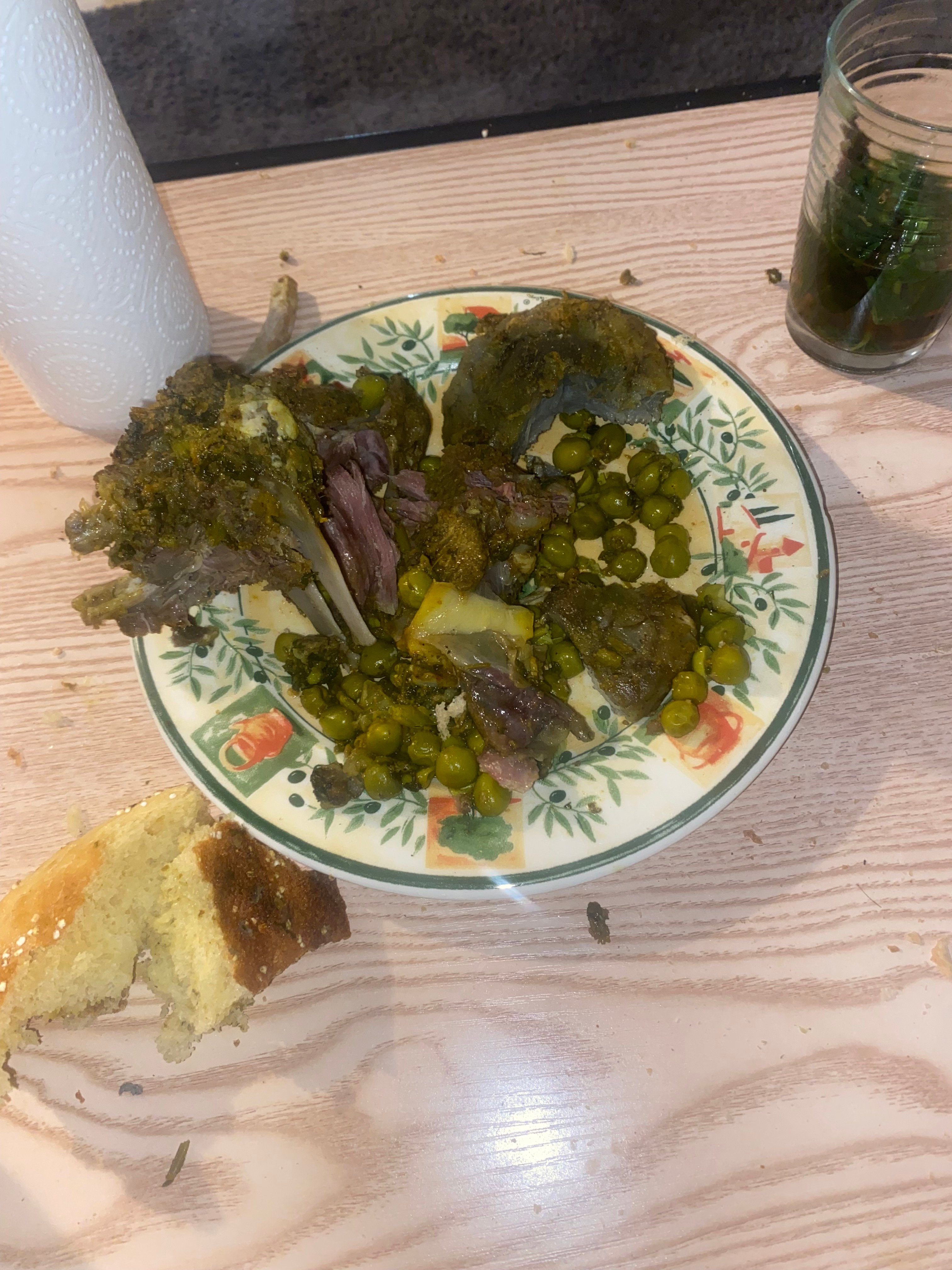 Mouton cuit à lettoufé petit pois brocolis artichauts