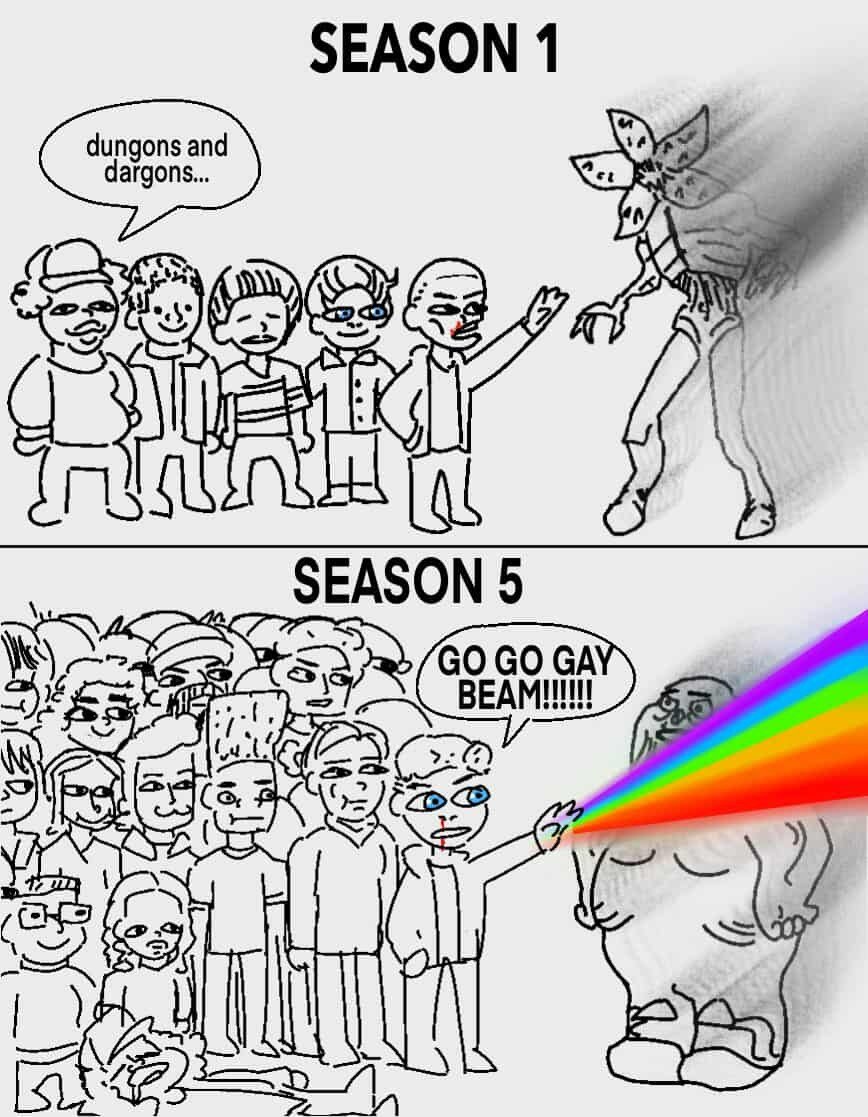 Il aime Mike déjà, et même si l'audience le sait depuis longtemps les personnages eux ne le savent pas à part son frère qui l'avait deviné. Le but c'est qu'un élément qui fait partie du personnage aboutisse à quelque chose, en l'occurrence ses doutes existentielles (légitimes étant donné le contexte de l'époque) et plus tard l'acceptation de ses proches, c'est tout. Je comprends pas quel intérêt supplémentaire ça devrait avoir, il faudrait qu'il batte Vecna avec le pouvoir des arcs-en-ciel ?