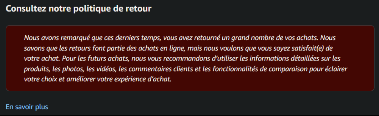 Bah oui mais aussi pourquoi tu retourne autant de colis c’est chiant les gens comme toi total soutien à Amazon