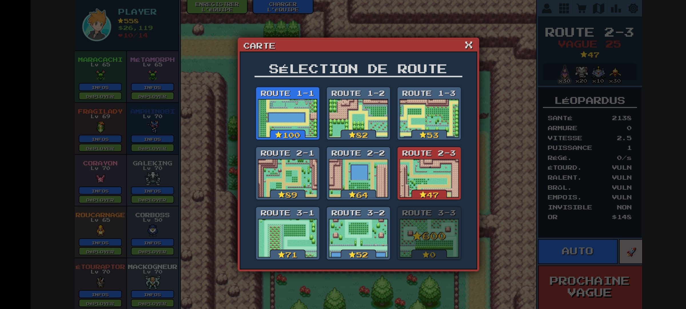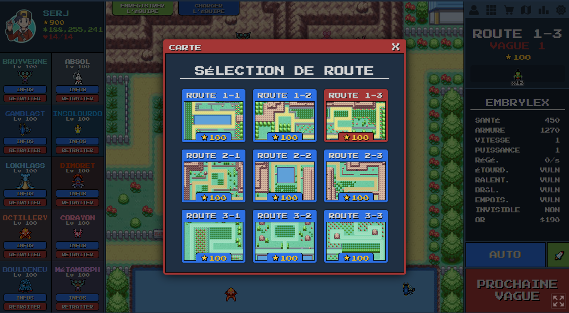 À part ça les autres je change pas mal, étouraptor est polyvalent, roucarnage fait un peu moins de dégâts. Ectoplasma pas mal si on le place bien. Maracachi gros dégâts sur certaines maps avec une case d'herbe bien placée