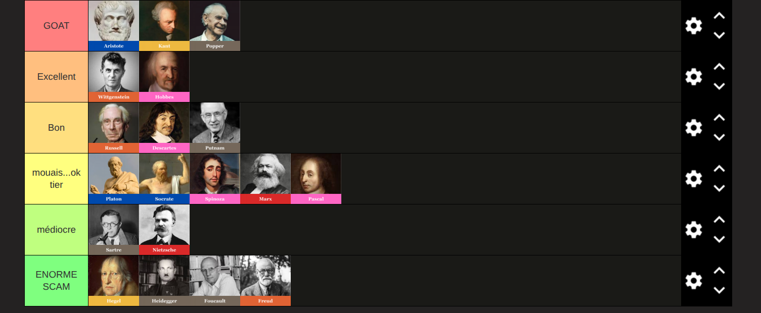 2/ Le principe même de faire des tiers list de philosophes comme si ça avait un sens alors que la philosophie est une sorte de magma en perpétuelle interconnexion (ce serait comme faire une tier list des organes vitaux) montre non seulement ta médiocrité, mais surtout un esprit comptable sans âme, ce qui questionne sur ce que tu as retenu des penseurs