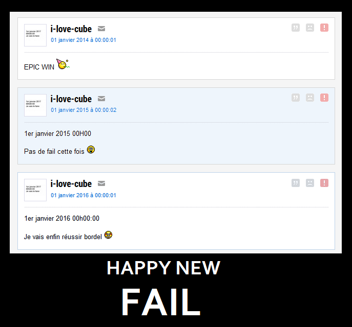 Le 31 décembre 2016 à 15:21:29 LePatriarche a écrit :J'imagine l'auteur : "Putain, j'ai niqué 3 Nouvel An pour ça "