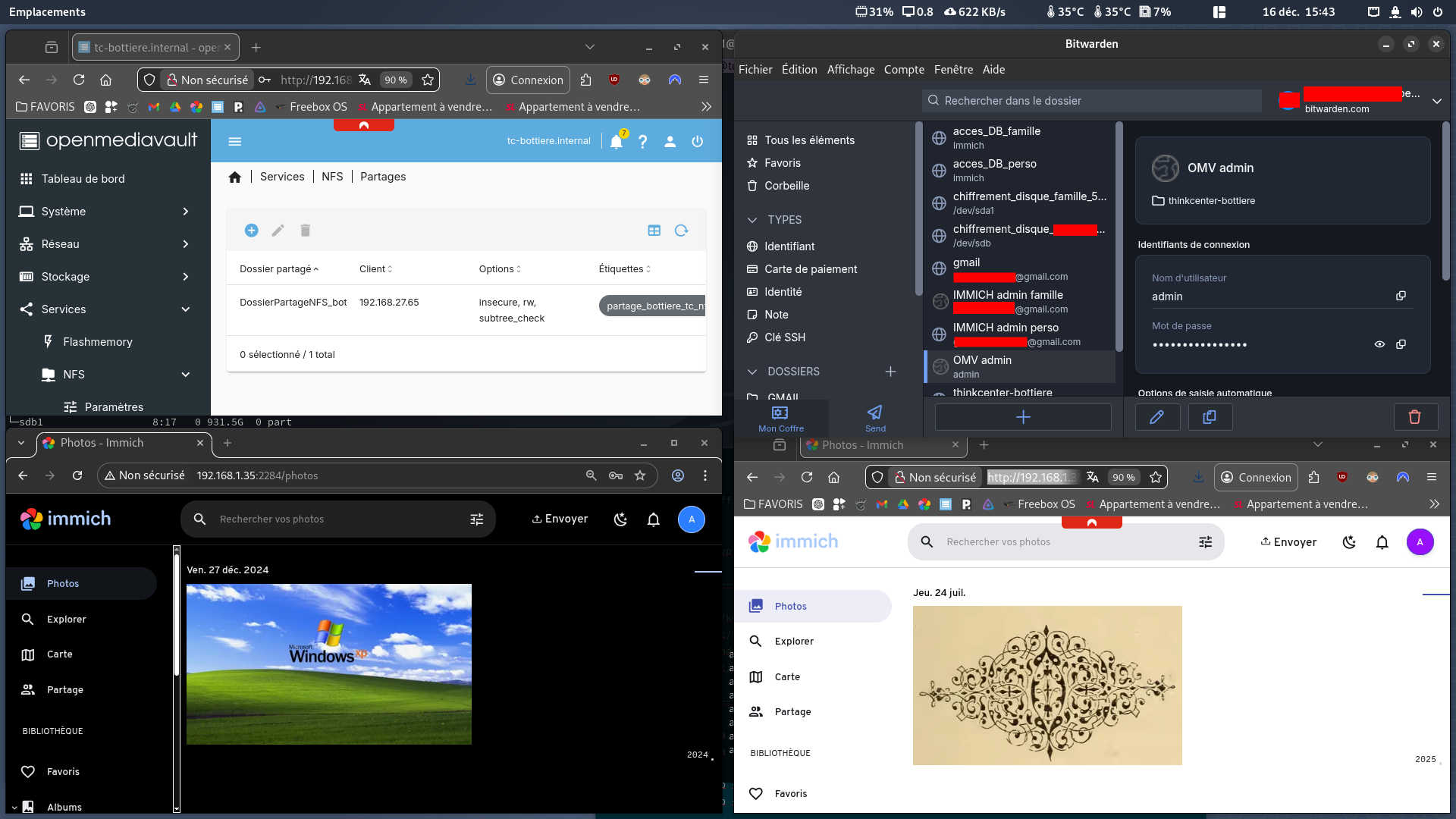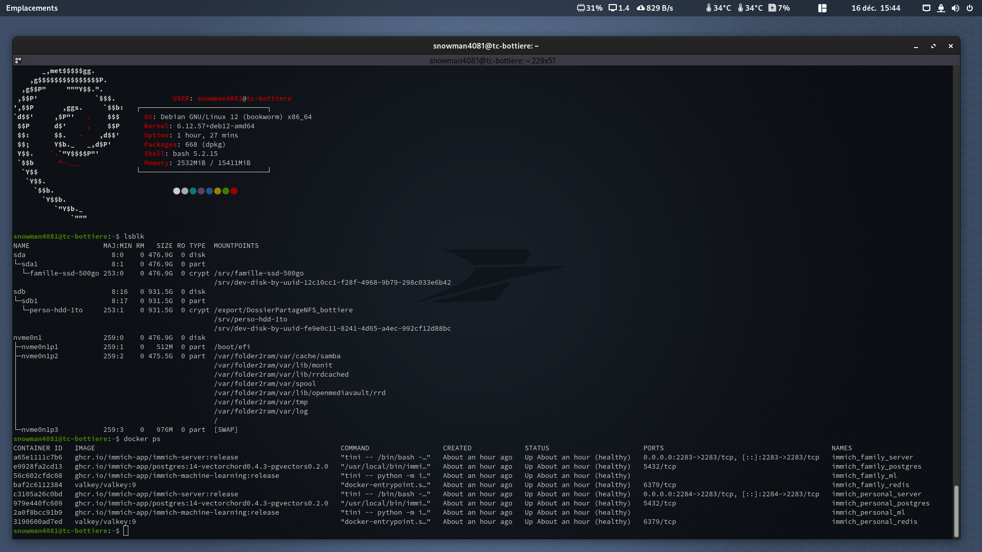-installé 2 instances Immich pour partager et sauvegardé les photos sur mes tel (adieu google), une pour moi et une pour mes parents, sur les 2 disques chiffré LUKS, accessible depuis n'importe où en passant par le serveur VPN de ma box.