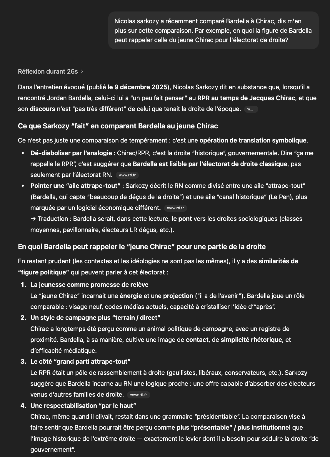 La comparaison Chirac / Bardella selon ChatGPTRéponse courte : non, ce n’est pas comparable.