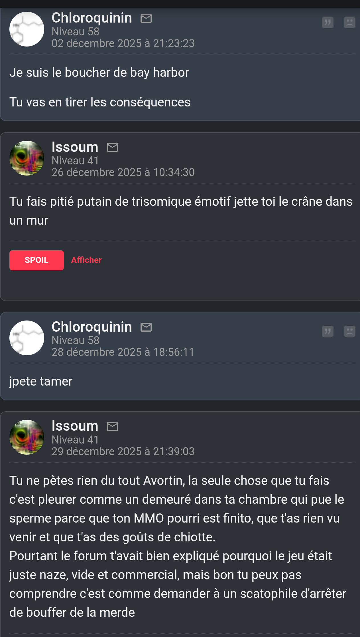 J’avais oublie mais arlong (un mec qui spam depuis des années des topics ou il critique one piece en disant que c’est de la merde avec ses differents secondaires mais avec toujours des noms de compte et pp provenant de cet univers) qui m’insultait en mp comme un vdd que j’ai cité juste au dessous car on avait un désaccord sur les mangas de mémoire