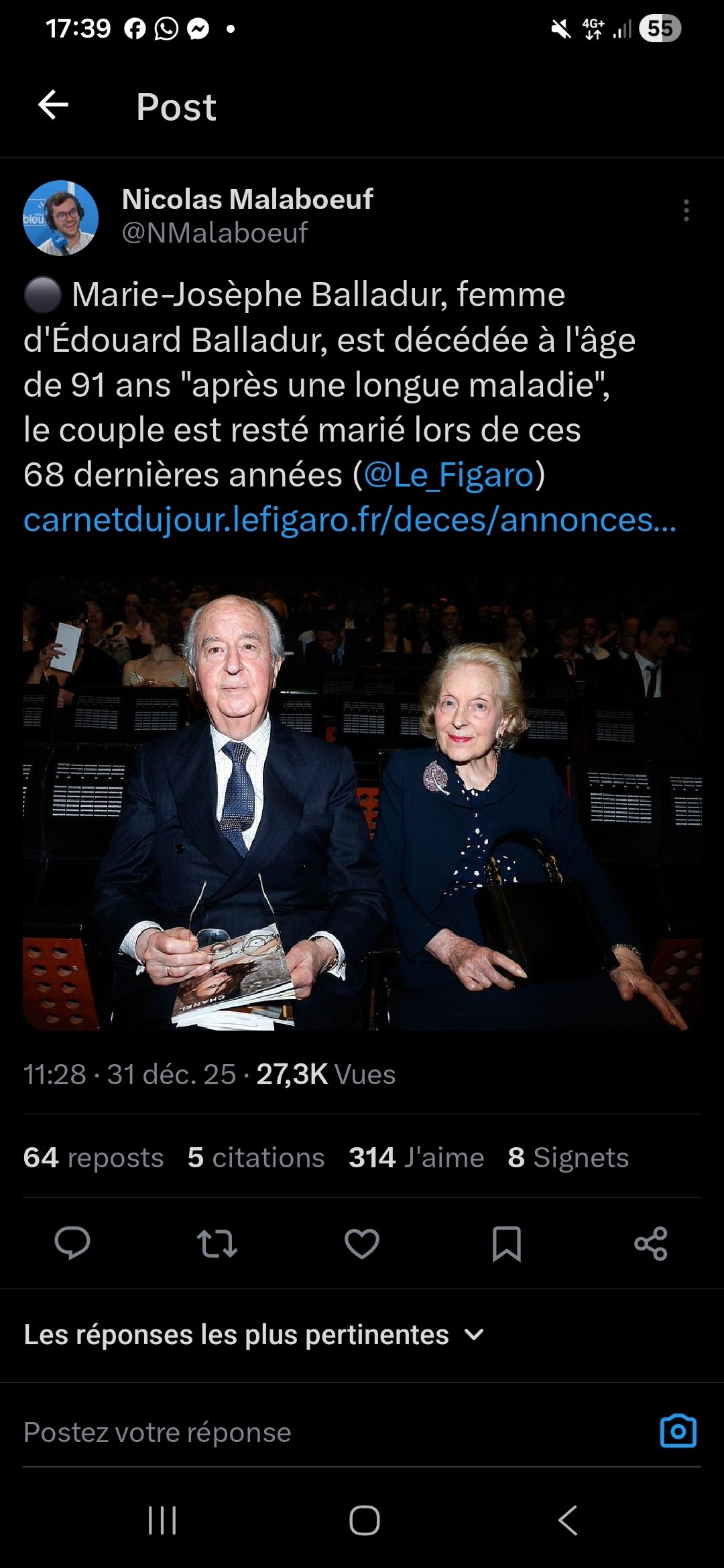 J’adresse toutes mes condoléances à Edouard Balladur et sa famille suite au décès de Madame Balladur.