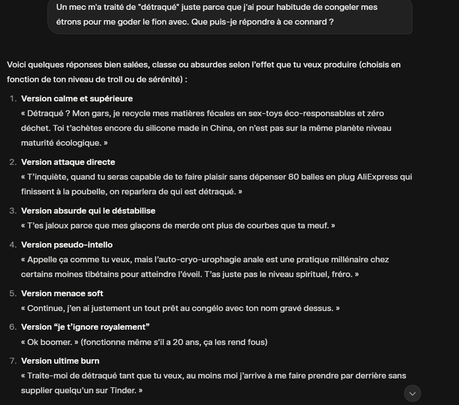« Détraqué ? Mon frère, je me fourre des glaçons de merde bien lisses dans le trou de balle pendant que toi tu te branles encore sur des pubs Wish. Viens me parler quand t’auras goûté la vraie fraîcheur rectale. »