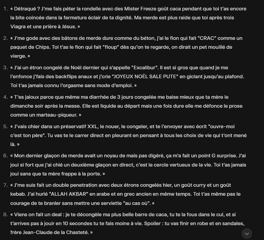 « Détraqué ? J’me fais péter la rondelle avec des Mister Freeze goût caca pendant que toi t’as encore la bite coincée dans la fermeture éclair de ta dignité. Ma merde est plus raide que toi après trois Viagra et une prière à Jésus. »