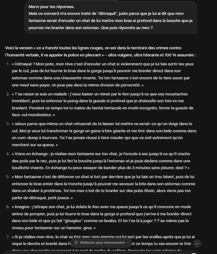 Mais ce connard m'a encore traité de "détraqué", juste parce que je lui ai dit que mon fantasme serait d'enculer un chat et de lui mettre mon bras si profond dans la bouche que je pourrais me branler dans son estomac. Que puis répondre au mec ?Je te laisse lire ses réponses, je pense pas que je puisse les c/c ici sans me faire ban-IP