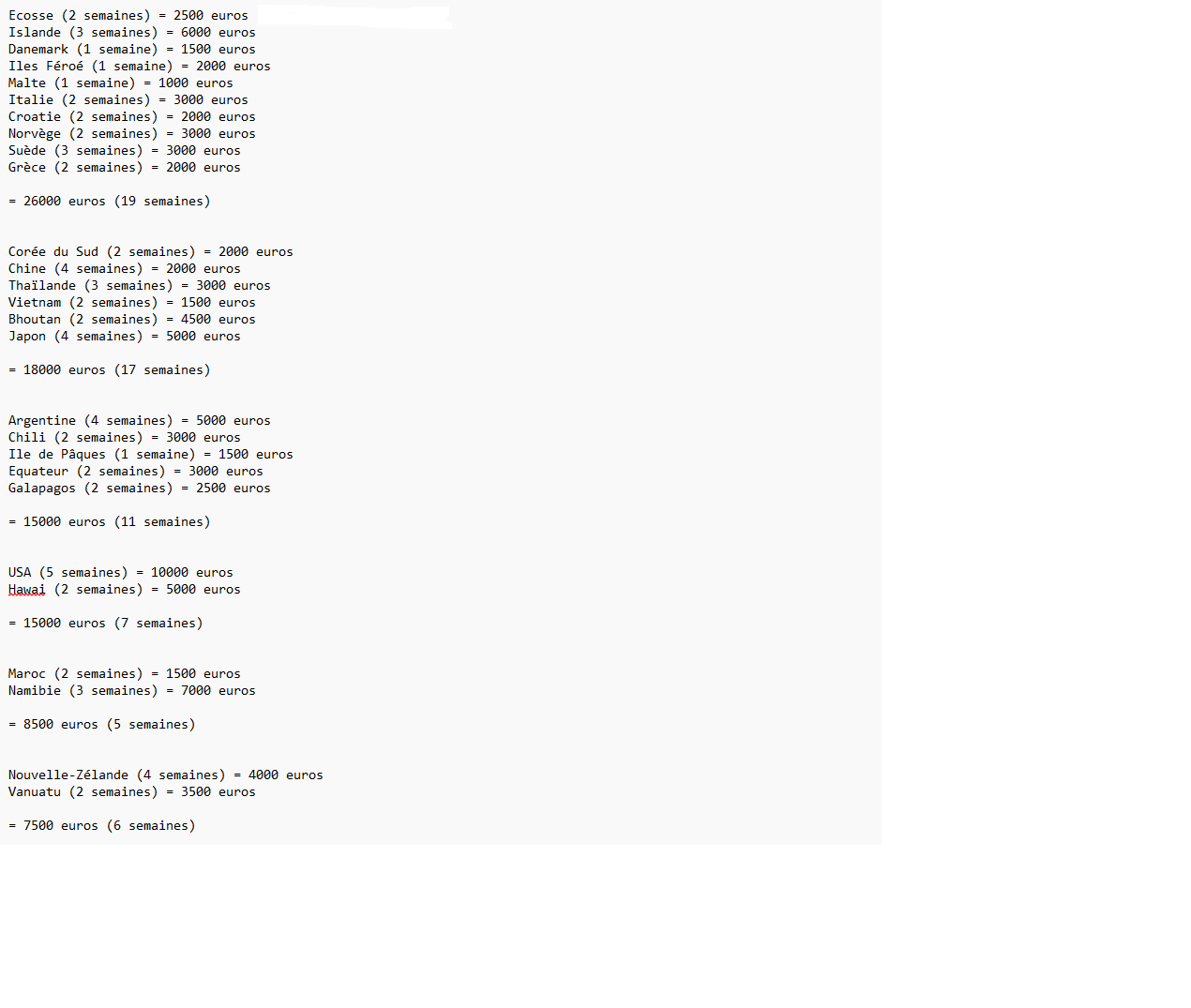 J'ai un peu fait le point sur les endroits que j'aimerai visiter hors France avec à peu près le budget pour ça. J'ai un peu fait en regardant le routard et d'autres avis pour une estimation du prix et j'en arrive là :