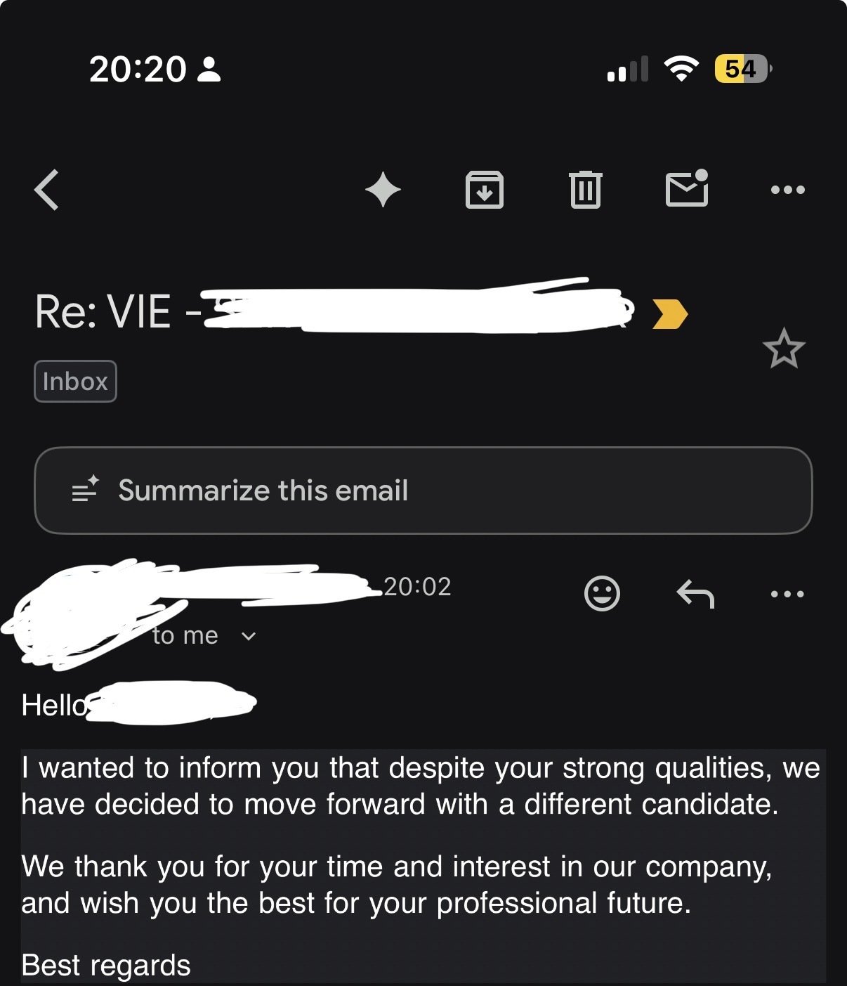 Ce n’est pas un mail automatique non non, c’etait le retour suite à un entretien qui s’est très bien passé, ma meilleure piste jusqu’à présent, j’y croyais fort