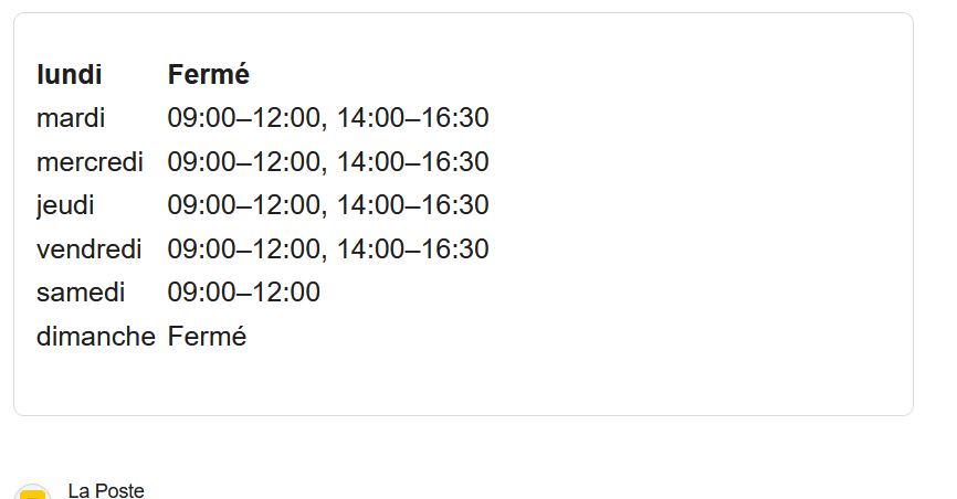 Oui je sais j'ai de la chance je suis dans un gros village de 200 personnes donc il y à un peu de services de dispo. Mais les horraires sont à chier. Les 3/4 du temps les actifs ne peuvent pas y aller sauf le samedi. Or le samedi la poste est réservée pour les trucs du style : le code auto, les services france identité...
