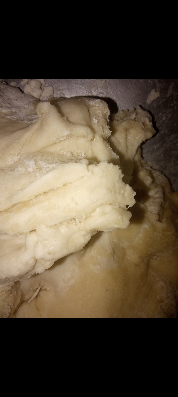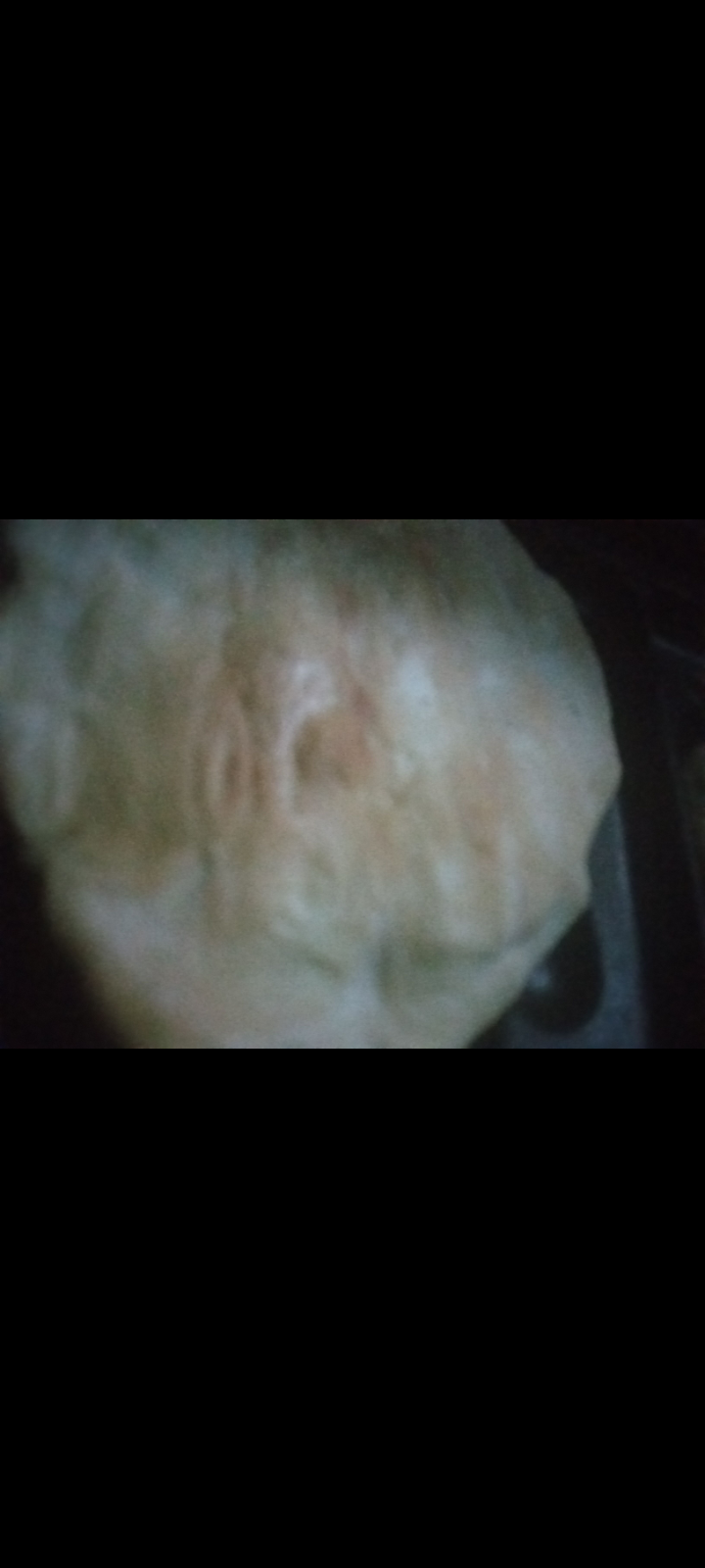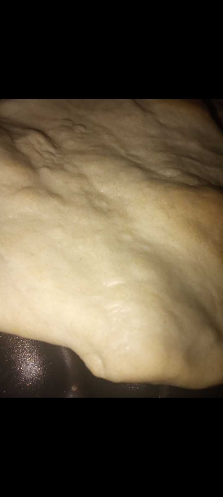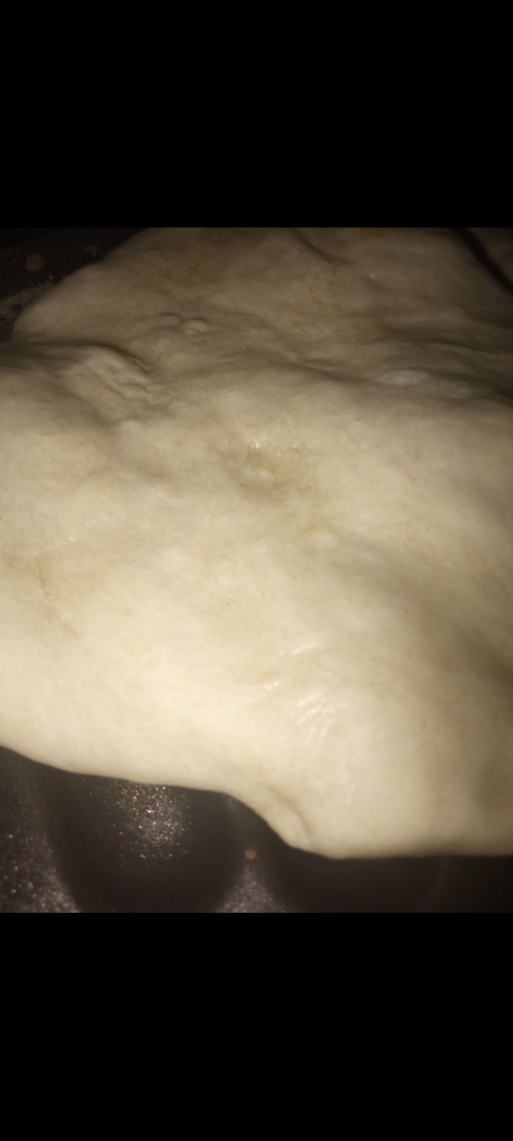 photo prise avant de retourner pour la première fois, comme tu peux peut-être deviner c'est cuit dans un appareil à gauffre c'est assez pratique quand t'as la flemme tu mets juste le morceaux de pâte entre les deux machins et ça cuit tout seul même si c'est meilleur de retourner entre deux dans une poêle ensuite c'est que mon avis, je fais une galette ronde et plate assez épaisse et je la pose dedans comme un croque-monsieur ou de la pâte à gauffre