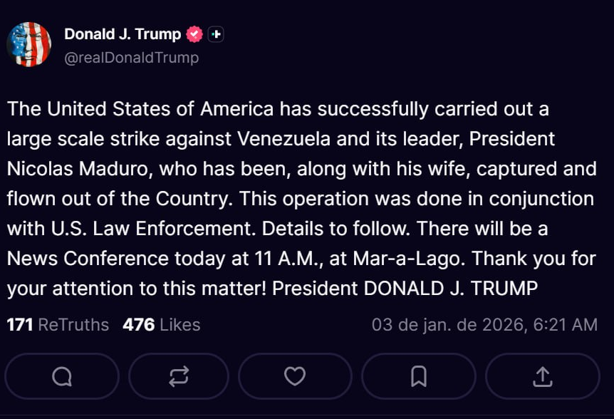 Les États-Unis d'Amérique ont mené avec succès une frappe de grande envergure contre le Venezuela et son dirigeant, le président Nicolas Maduro, qui a été, avec sa femme, capturé et sorti du pays par avion. Cette opération a été menée en collaboration avec les forces de l'ordre américaines. Des détails suivront. Une conférence de presse aura lieu aujourd'hui à 11h, à Mar-a-Lago. Merci de votre attention à cette affaire! Le président DONALD J. TRUMP