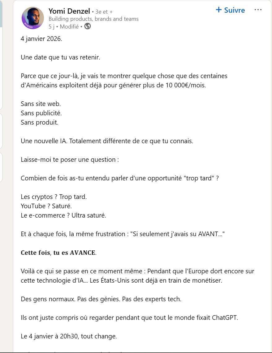 J'ai regardé 10 mins, c'est possible pour certain de pas voir que c'est un énorme scam ?dans un business en ligne tu vends par l'emotion. Toutes les personnes qui regardent vont pas acheter son truc qu'il va marketer a la fin. Mais parmi eux il va yavoir ceux qui se disent "j'en ai marre de mon taf, je l'aime pas, mes collegues sont chiants et mon patron est aigri, je veux changer de vie". Ceux qui souffrent au quotidien de leur situation vont acheter.
