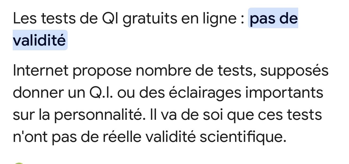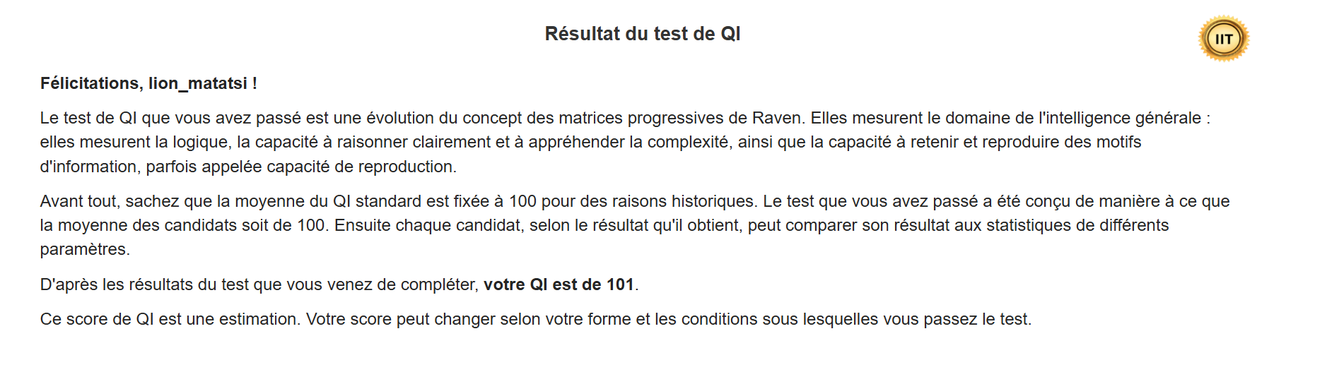 si tu connais d'autres tests gratuits standardisés à 100 avec écart type 15, et une estimation facteur g interne publiée hésite pas à me dire (avec rapports à l'appui)