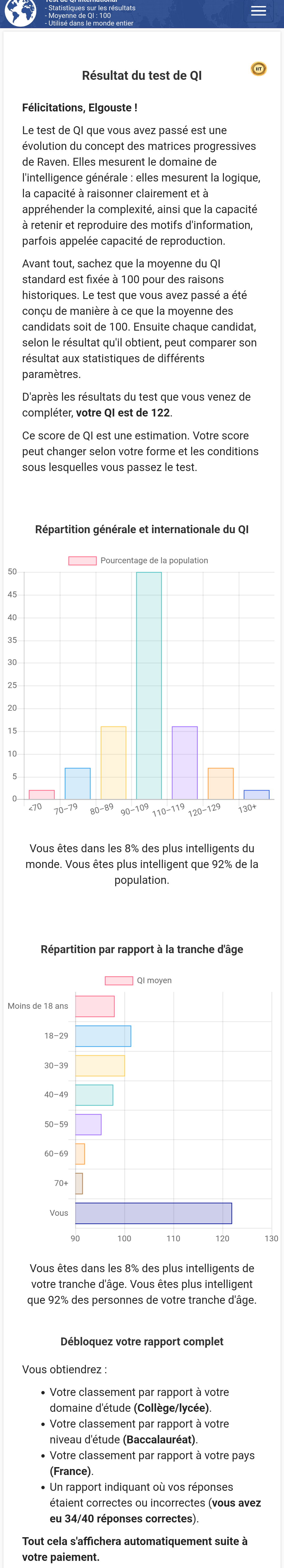 Je viens de passer le test de QI international (standardisé avec une moyenne de QI: 100, écart-type: 15)