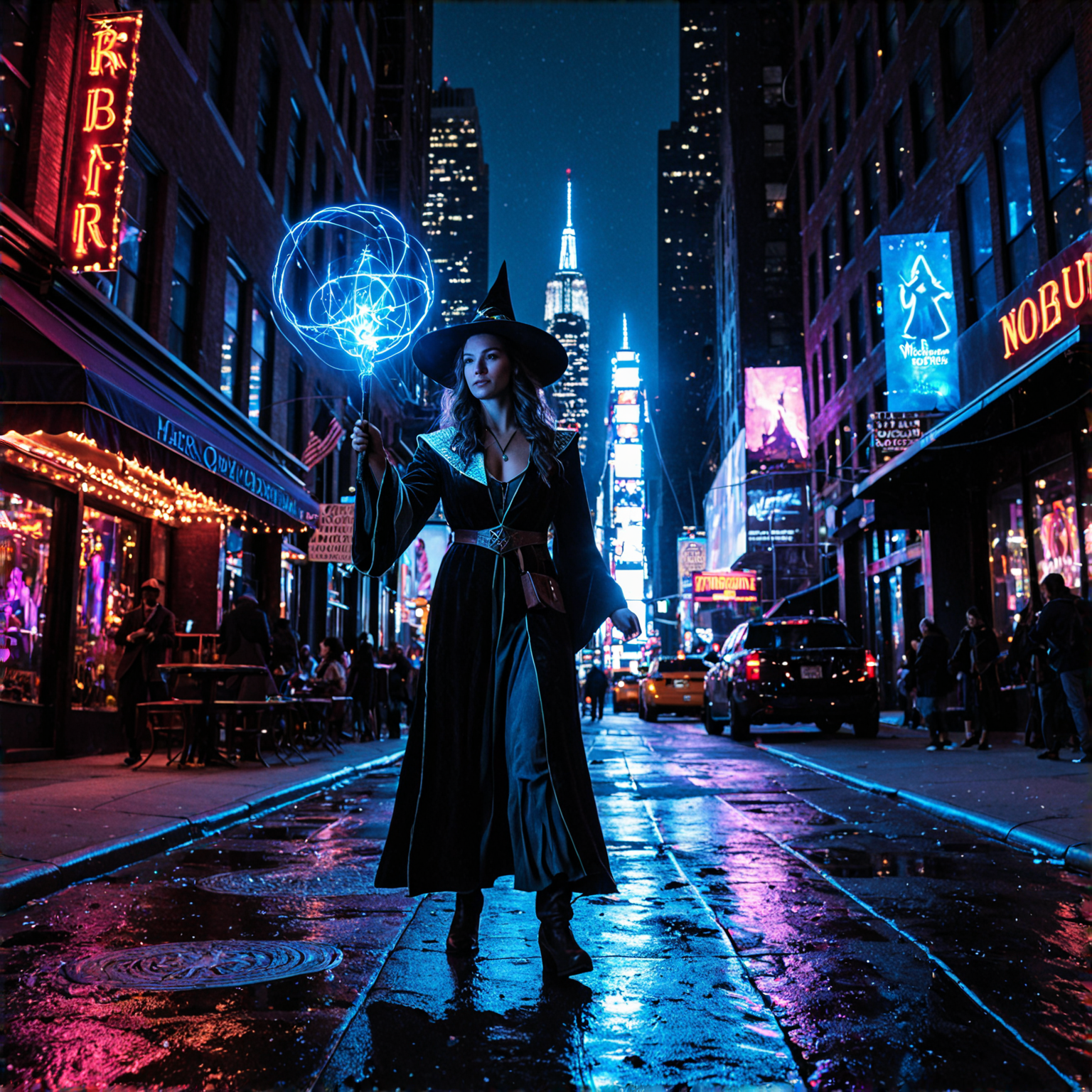 Fait une magicienne qui s'amuse avec ses pouvoirs nonchalamment dans les rue de new york la nuit sous les lumières des néons