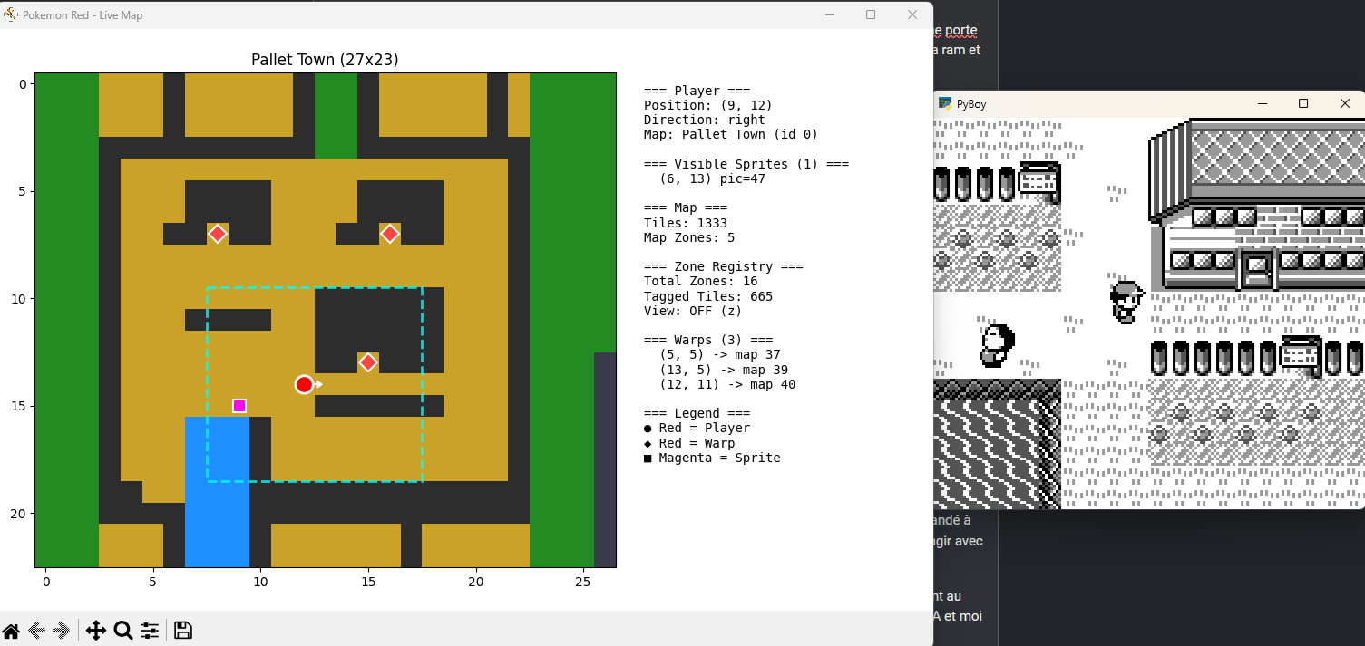 En gros sur la game boy, on a une vue centrée sur le personnage de 9 px x 9px. Pyboy fourni l'état de la mémoire pour chaque case ainsi qu'un masque de collision et la position du joueur.