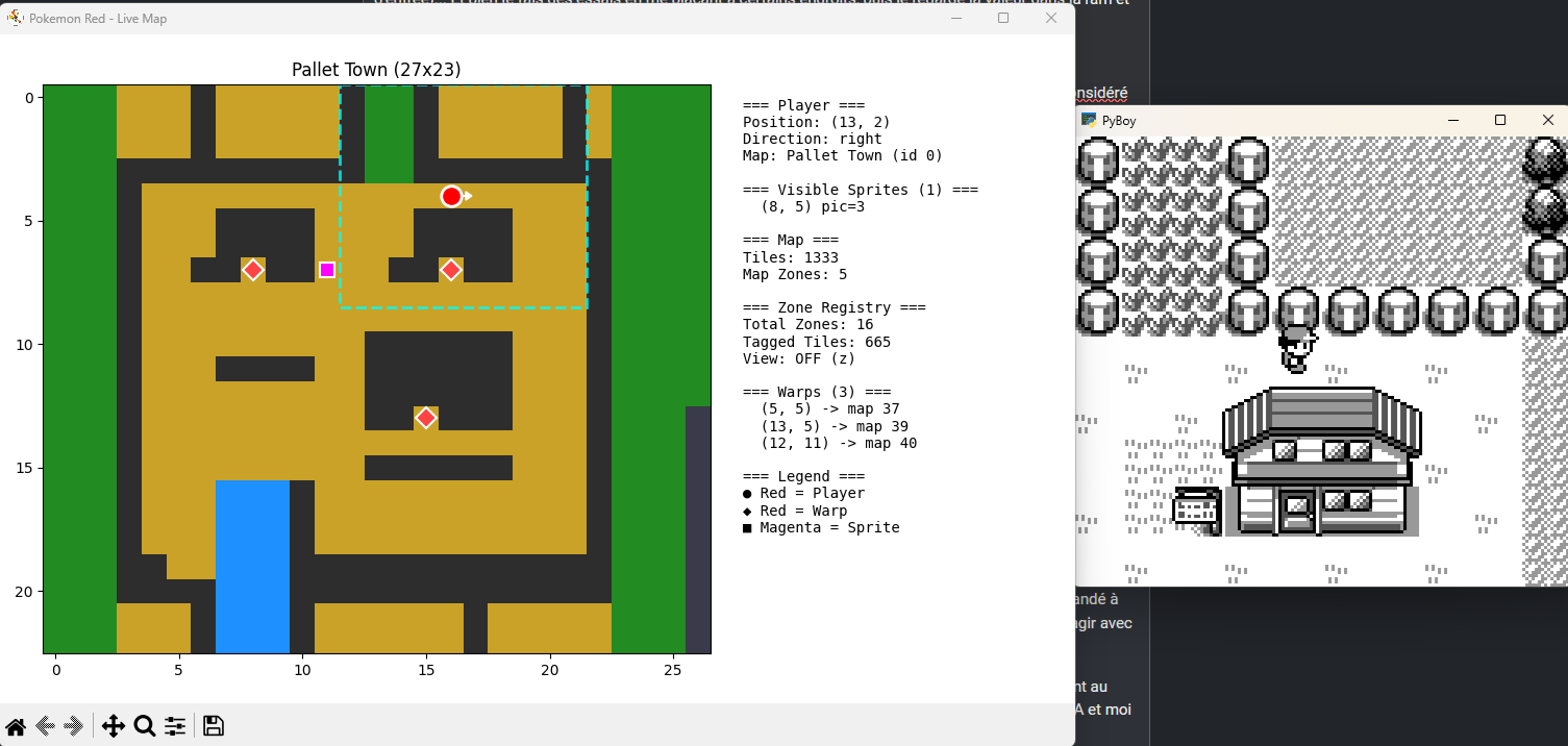 Ensuite j'ai demandé à Claude de me coder une petite view qui se syncronise en live en affichant la carte exploré à côté de la vue "game boy" et voici le resultat final. Chaque couleur représente une information utile (bloc infranchissable, PNJ, warps, hautes herbes, eau) et la vue est syncroniser avec le jeu quand je me déplace.