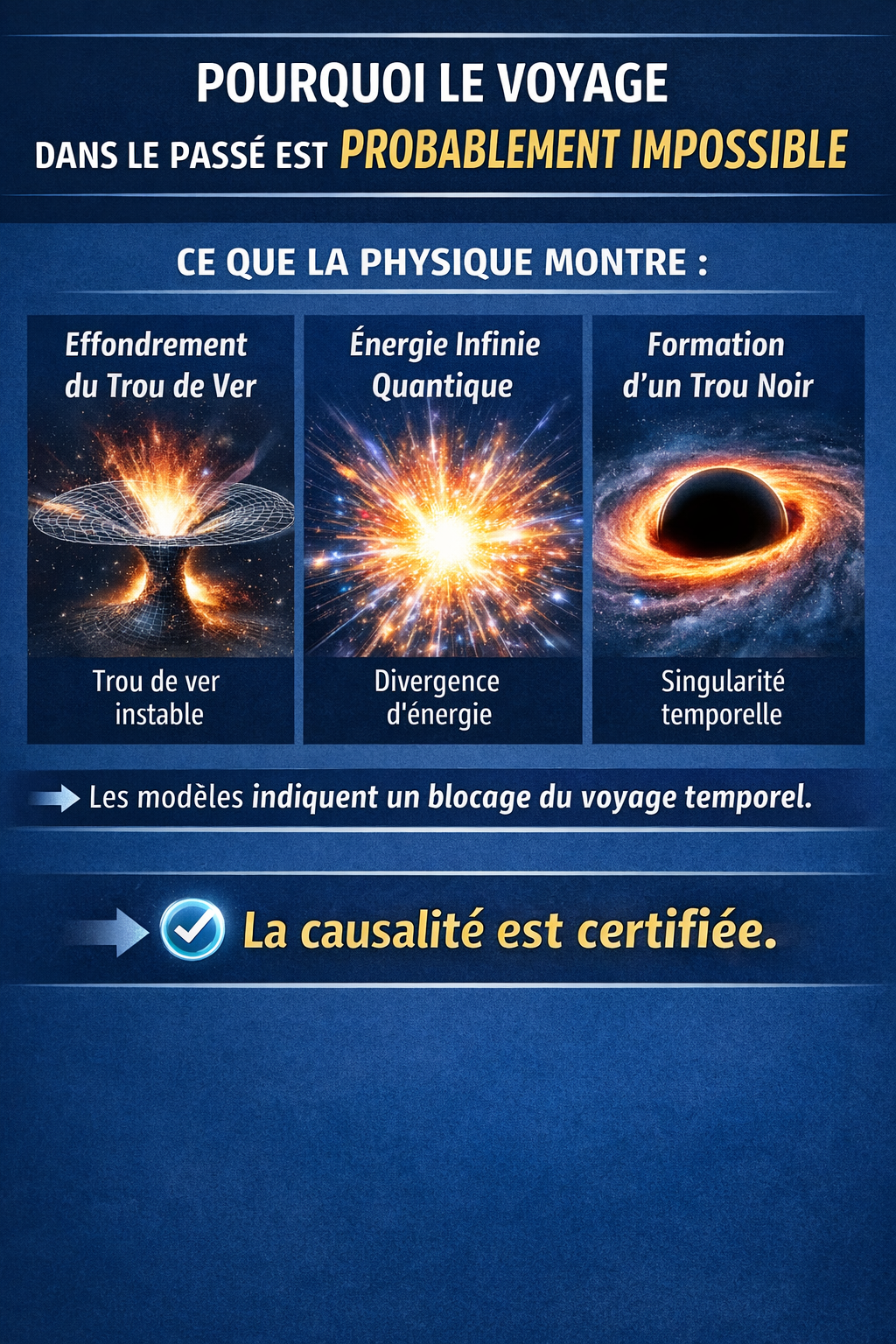 Selon la Conjecture de protection chronologique de Stephen Hawking, voyager dans le passé est pratiquement impossible. Si on tentait de le faire via un trou de ver, les particules quantiques tourneraient en boucle entre le passé et le futur à l’intérieur du tunnel, accumulant une énergie infinie. Cela provoquerait soit l’effondrement du trou de ver, soit sa transformation en trou noir, rendant toute traversée impossible. L’espace-temps se protège ainsi naturellement pour préserver la causalité.