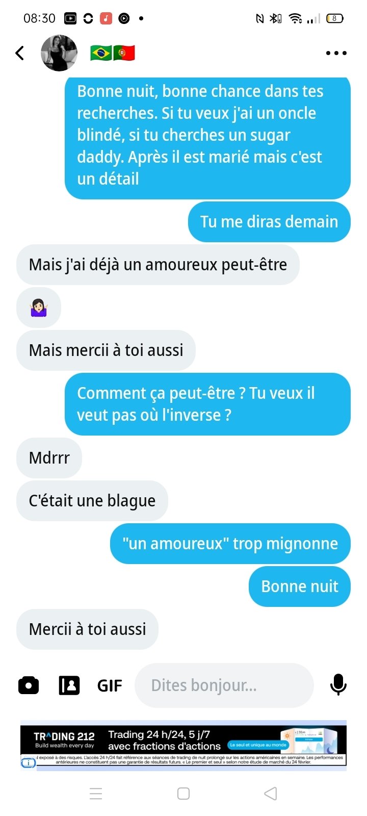 t'es trop con déjà pk tu pars défaitiste et t'as pas vu la perche tendue quand elle te dit qu'elle a déjà un amoureux peut-êtreMais dans tous les cas elle avait l'air chiante donc tu perds pas grand-chose