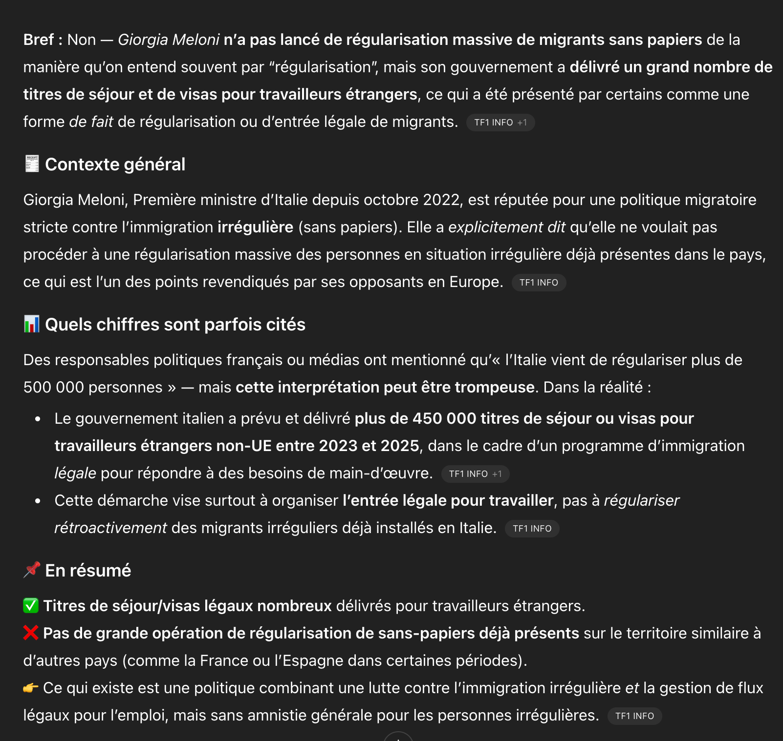 Et bien si, Méloni a limité l'immigration à la stricte immigration de travail: des visa de max 1 an, et que des visa de travail. Le regroupement familial est devenu pratiquement impossible