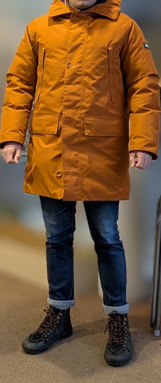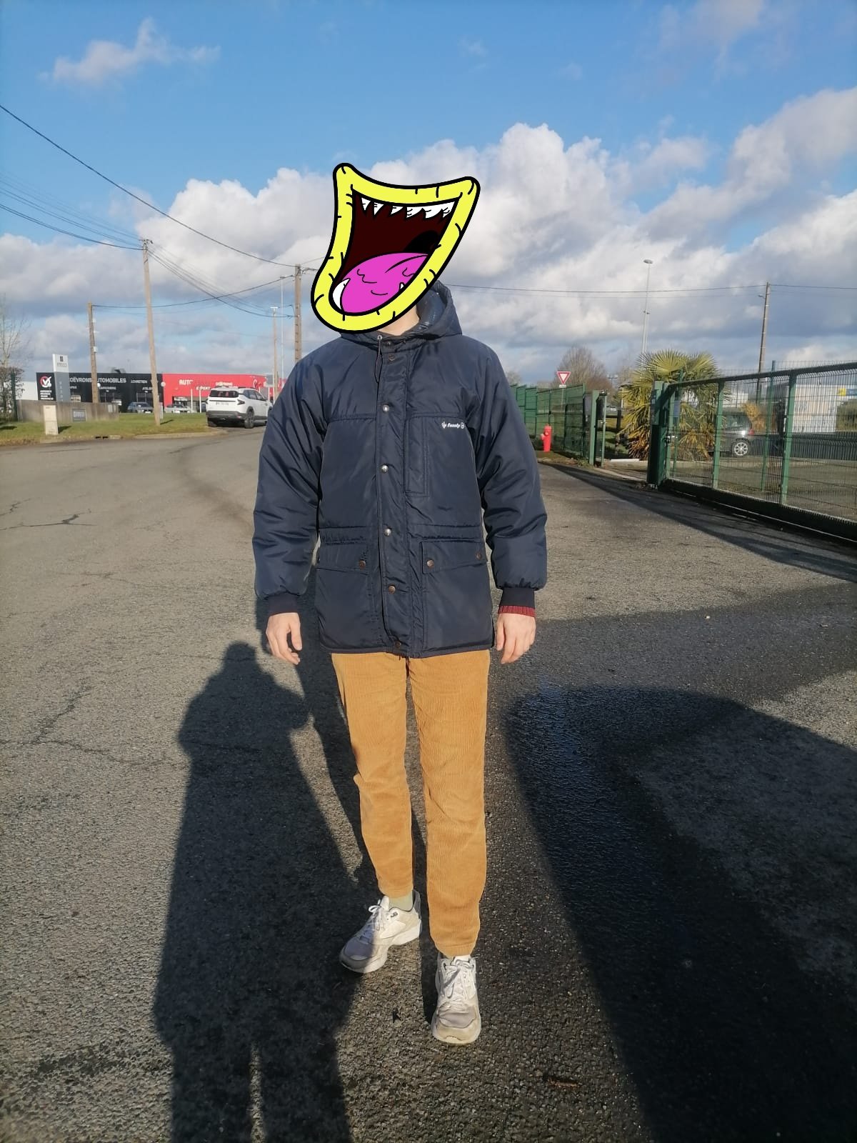 bah pantalon ajusté, chemise, chaussures de ville pas des basket de collegien avec un manteau de camioneur