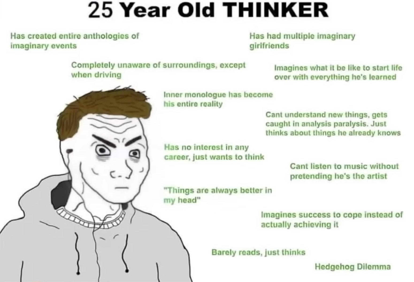 Peu d’actions, tout dans la pensée, je m’imagine dans ma vie de rêve, je m’imagine si je faisais ci ou ça, je vis presque jamais l’instant présent, je me dis toujours « bon une fois que j’ai finis ça.. je deviendrais ça.. »
