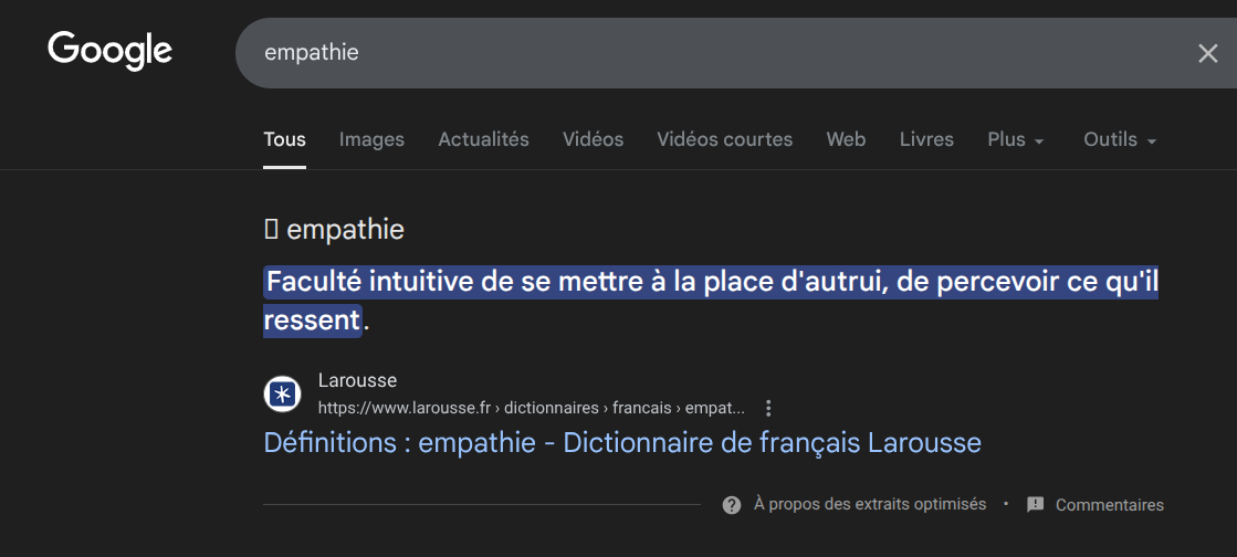 Empathie = te sentir mal quand quelqu'un d'autre souffre, osef de vos définitions de midwit, même un chien sait ce qu'est l'empathie
