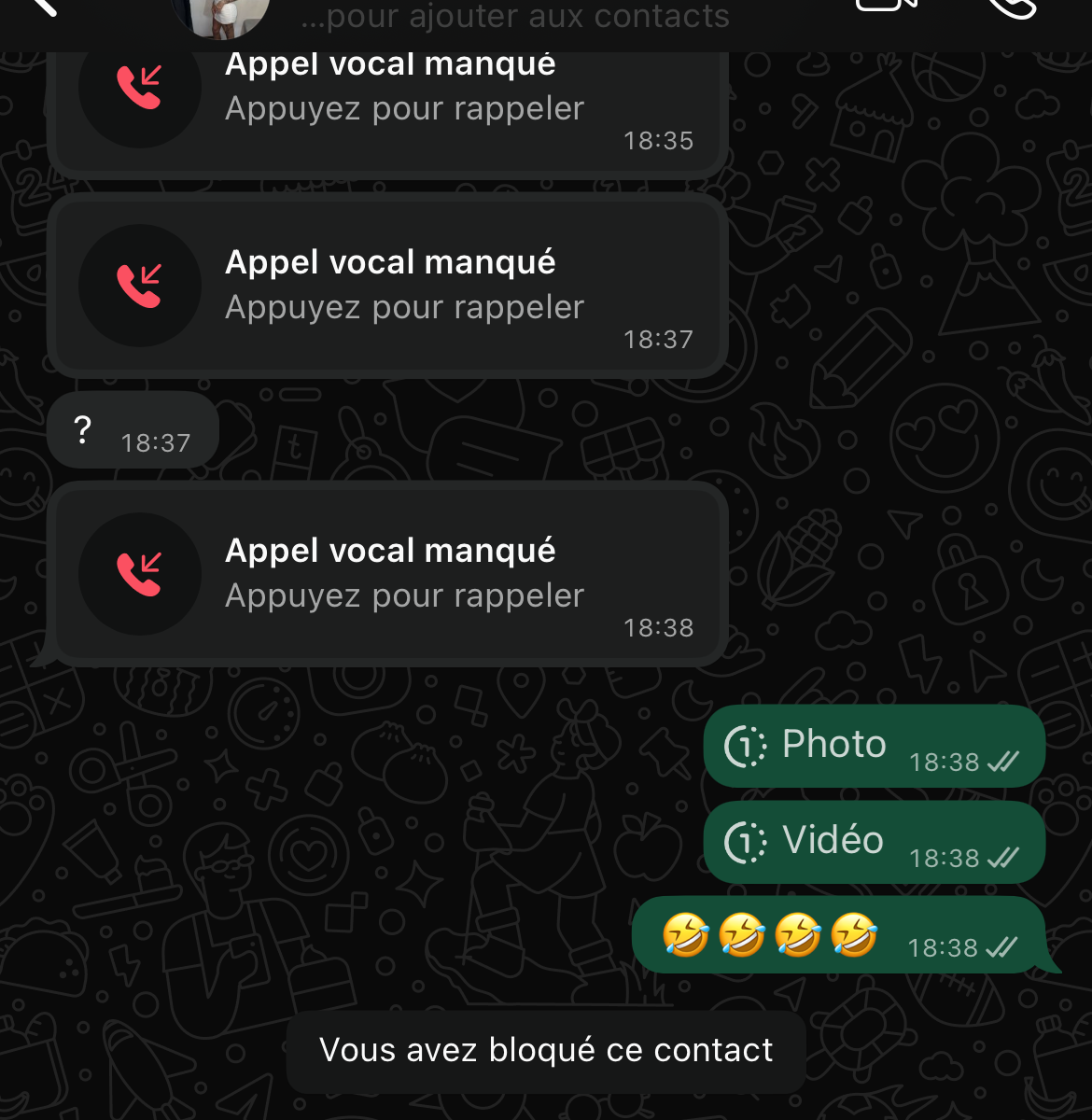 C'était ya 2j, hier elle m'envoie un message de menace (soi disant ils m'ont filmé et elle m'a dit "tu veux que je vienne à ton hotel ?), je lui ai envoie "vasy viens ntgm je suis dans l'avion hahahahaha" avec des vidéos dans ma bibliiothèque et bloquée