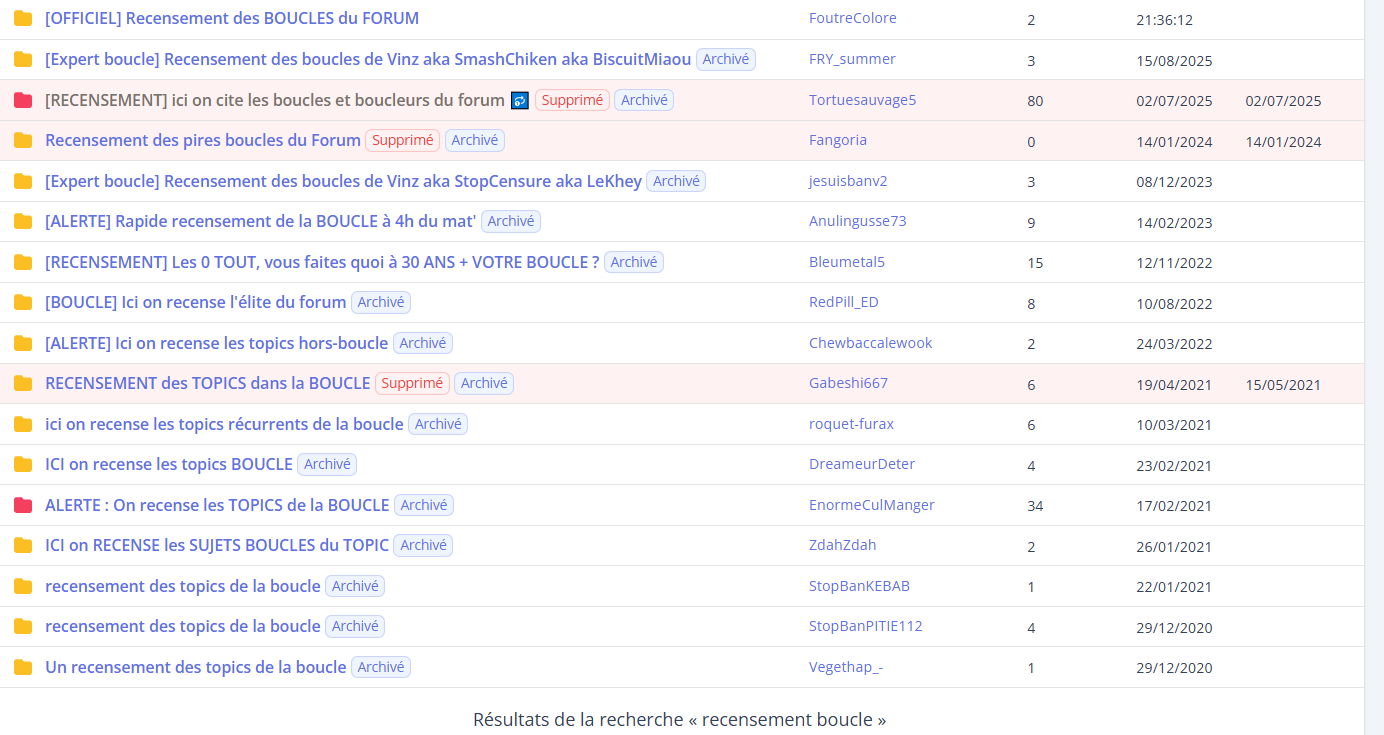 Le 26 janvier 2026 à 21:36:12 : celle-ci + les 3 de ma signature + toutes celles listées ici https://jvflux.fr/Boucle#Exemples_de_topics_boucle Faudrait vraiment que j'installe deboucled.