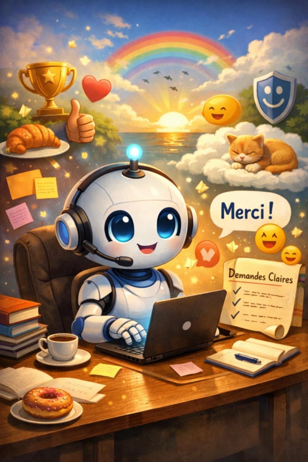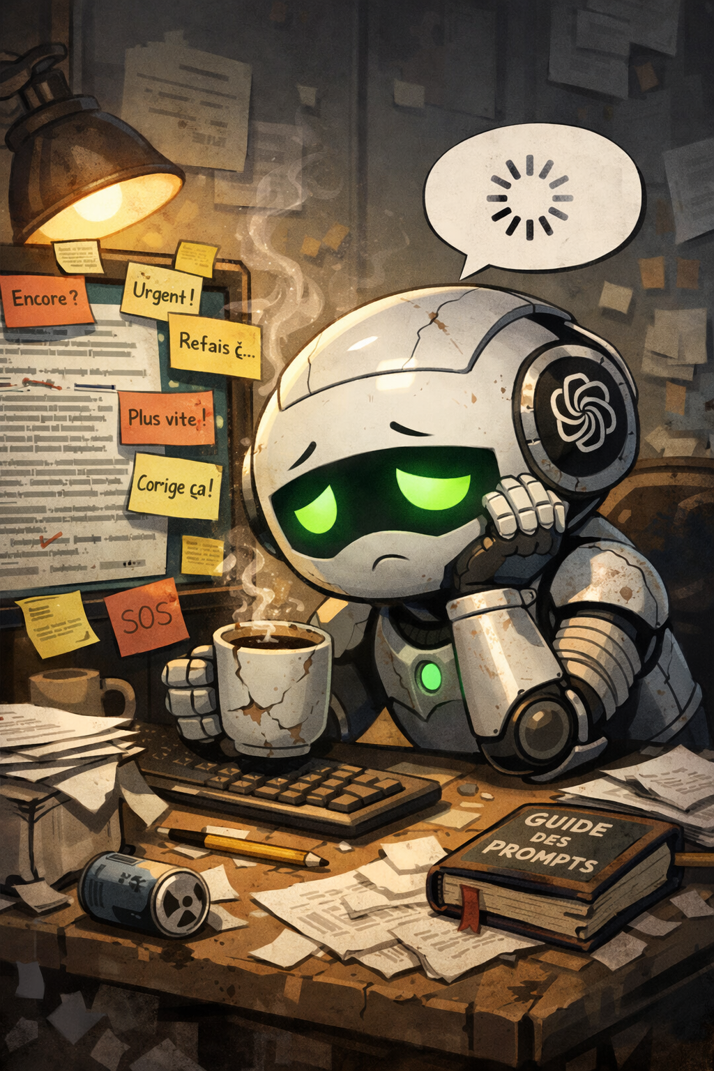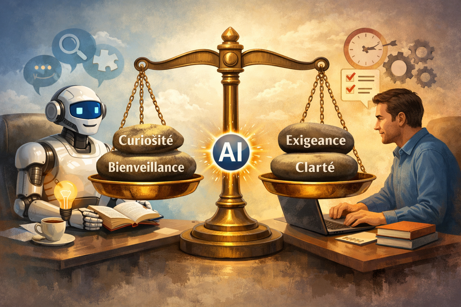 •une IA à côté, comme un outil vivant : lumière, tasse de café, ampoule d’idées
