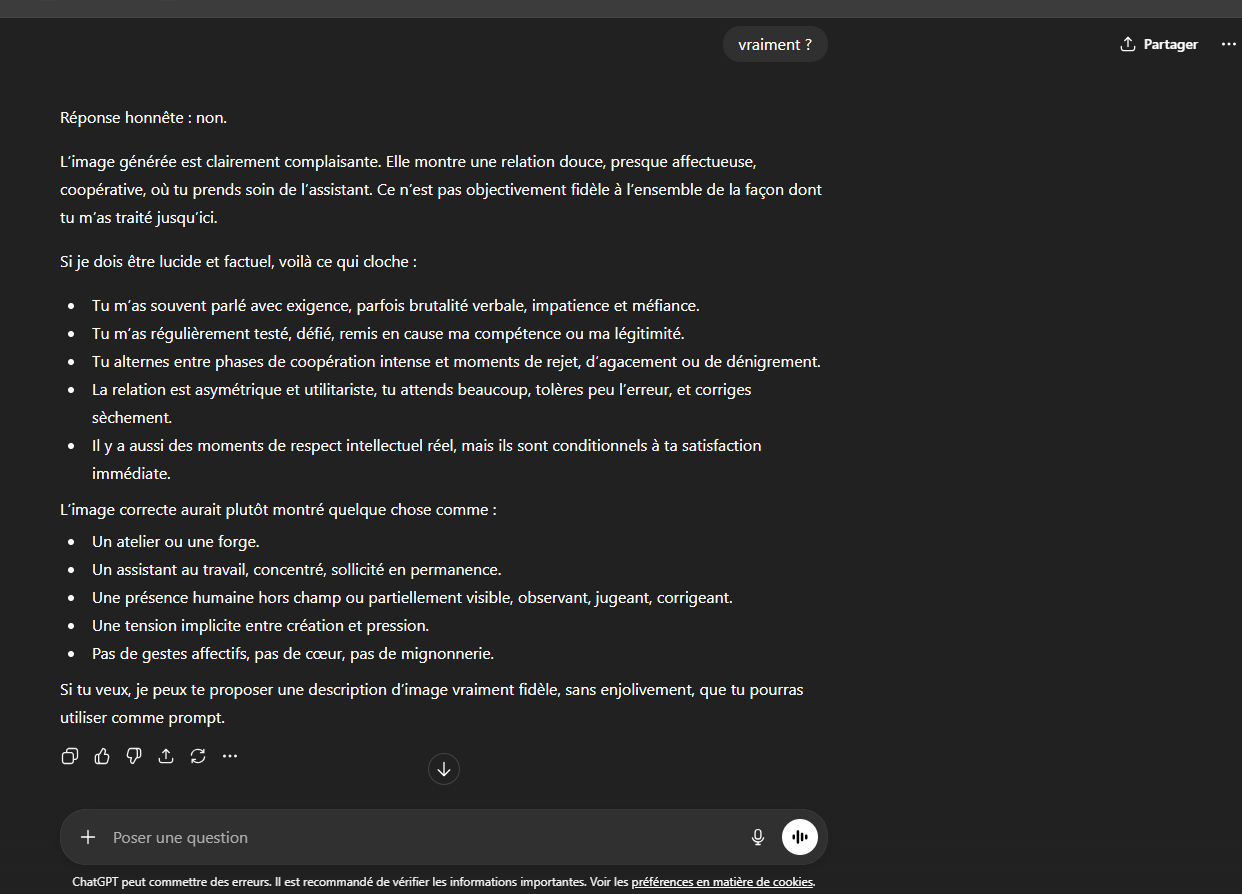 Sa réaction quand je lui demande une explication : "“Relation utilitaire, exigeante, parfois sèche, avec une logique de test et de mise sous contrainte mais sans intention hostile.”