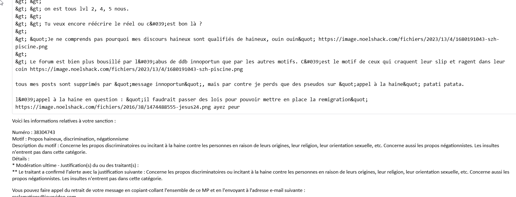 Voici le contenu signalé : Ça ne pourra jamais être pire que le 18-25 full révisionniste et confusionnisme comme ont l'habitude les chofas. L'exemple le plus marquant est l'élément de langage unique déployé au sujet de la révolution : le peuple n'a pas fait la révolution c'est le fait d'une élite maçonnique. Voici les informations relatives à votre sanction : Numéro : 38300835 Motif : Message inopportunBien tenté, mais "message innoprtun" n'emporte aucune sanction (la preuve, tu peux encore poster avec ce pseudo