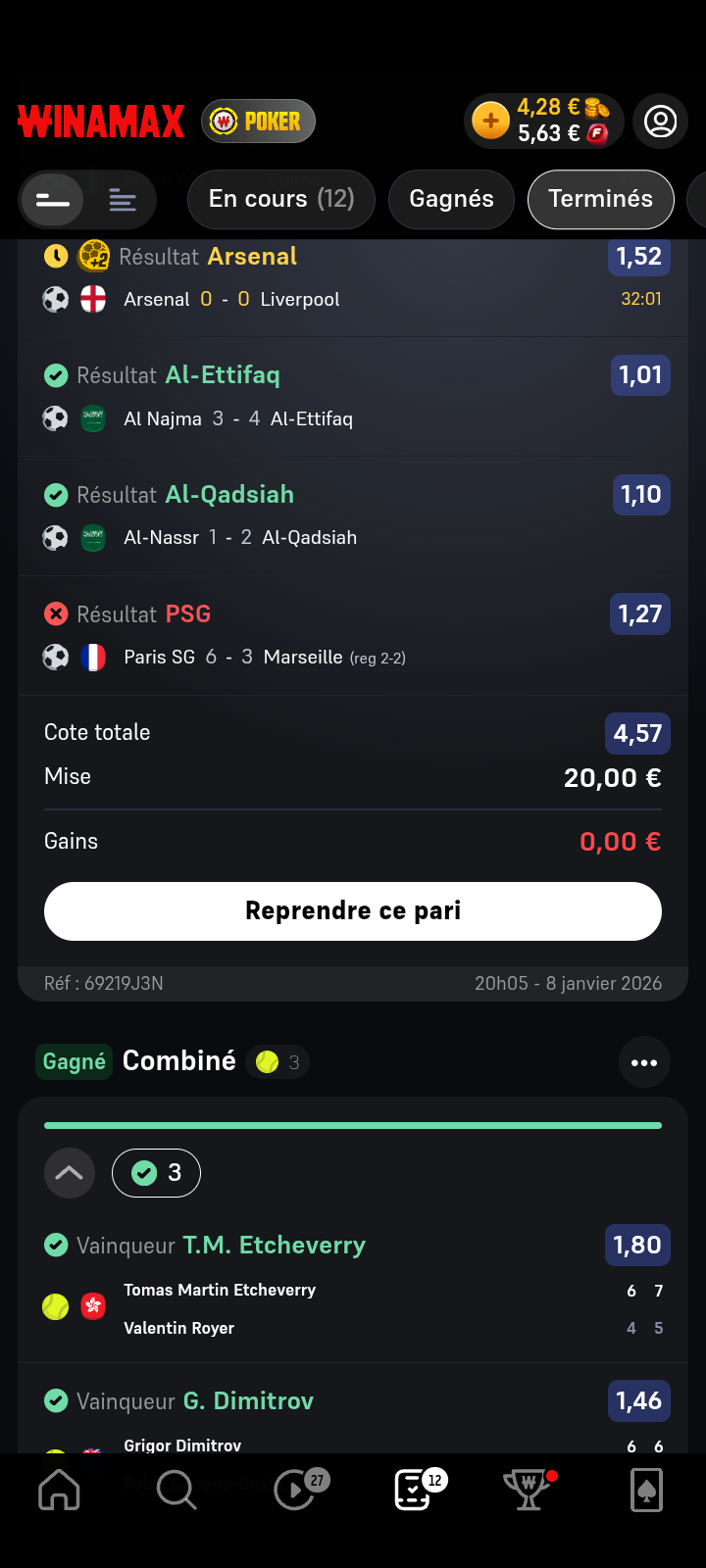 C'est déjà arrivé pour des paris d'un seul match que l'équipe sur laquelle je parie gagne suite aux tab et que j'empoche le gain, mais là le combiné a déjà été donné perdant alors que j'ai déjà gagné des paris comme ça suite aux tab ou prolongations.