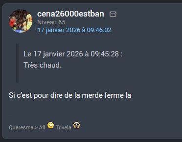 Le 17 janvier 2026 à 09:53:47 :Hop vengé Lop t’es ban Arroseur aroserEssayer de lui envoyer un mp vous verrez bien La provocation n’a pas sa place dans JVCLa prochaine fois tu arrêteras de vouloir humilier des kheys