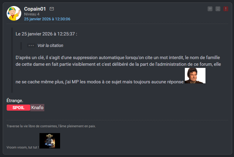 Le 25 janvier 2026 à 13:28:57 :J'ai tout listé dans ma signature mais le topic a été 410, je vous invite à tester le script, 3800 mots recensés.