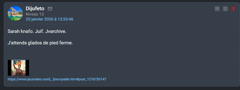 Le 25 janvier 2026 à 13:36:02 :Le 25 janvier 2026 à 13:31:05 :Le 25 janvier 2026 à 13:28:57 :J'ai tout listé dans ma signature mais le topic a été 410, je vous invite à tester le script, 3800 mots recensés.il fait beau à tel aviv ?Je suis dans le nord