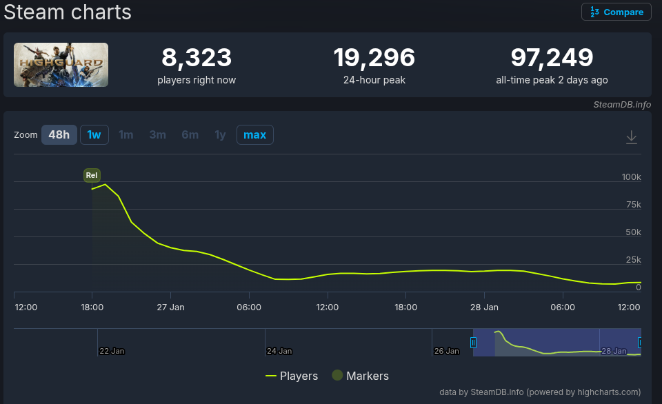 Il faut rappeler que Concord était payant, Highguard est F2P. Si on veux faire une comparaison honnête, il ne faut pas regarder le nombre brut de joueurs mais le pourcentage de déclin sur une période équivalente. En 3 jours, Concord est passé de 697 à 250 joueurs, soit une chute de "seulement" 64%.