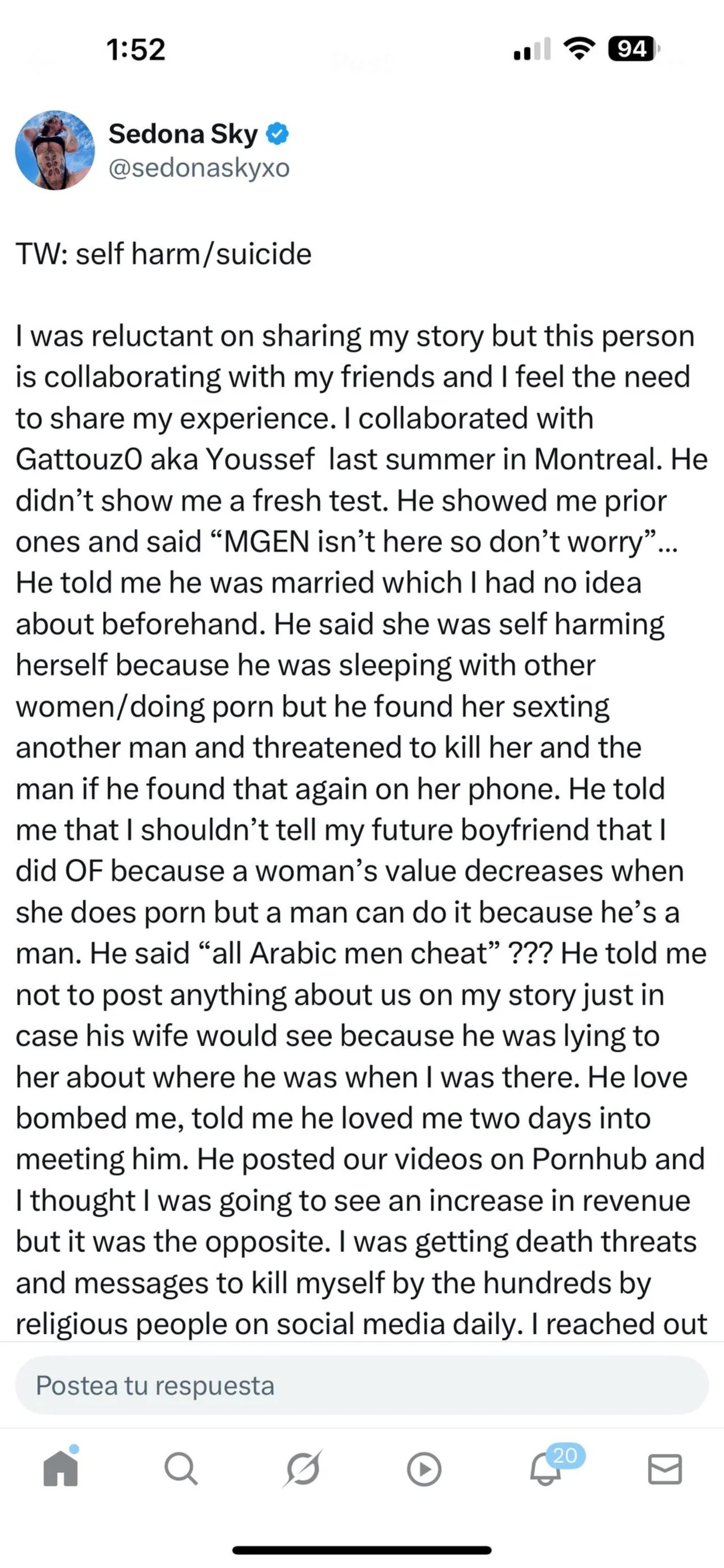 Il a publié nos vidéos sur Pornhub. Je pensais que mes revenus allaient augmenter, mais c'est l'inverse qui s'est produit : j'ai reçu des centaines de menaces de mort et de messages m'incitant au suicide de la part de personnes religieuses sur les réseaux sociaux. J'ai contacté Gattouz0 pour qu'il supprime nos vidéos, il a refusé. J'ai donc dû contacter Pornhub moi-même pour révoquer mon consentement (j'ai les e-mails de preuve) et, heureusement, ils les ont retirées immédiatement.