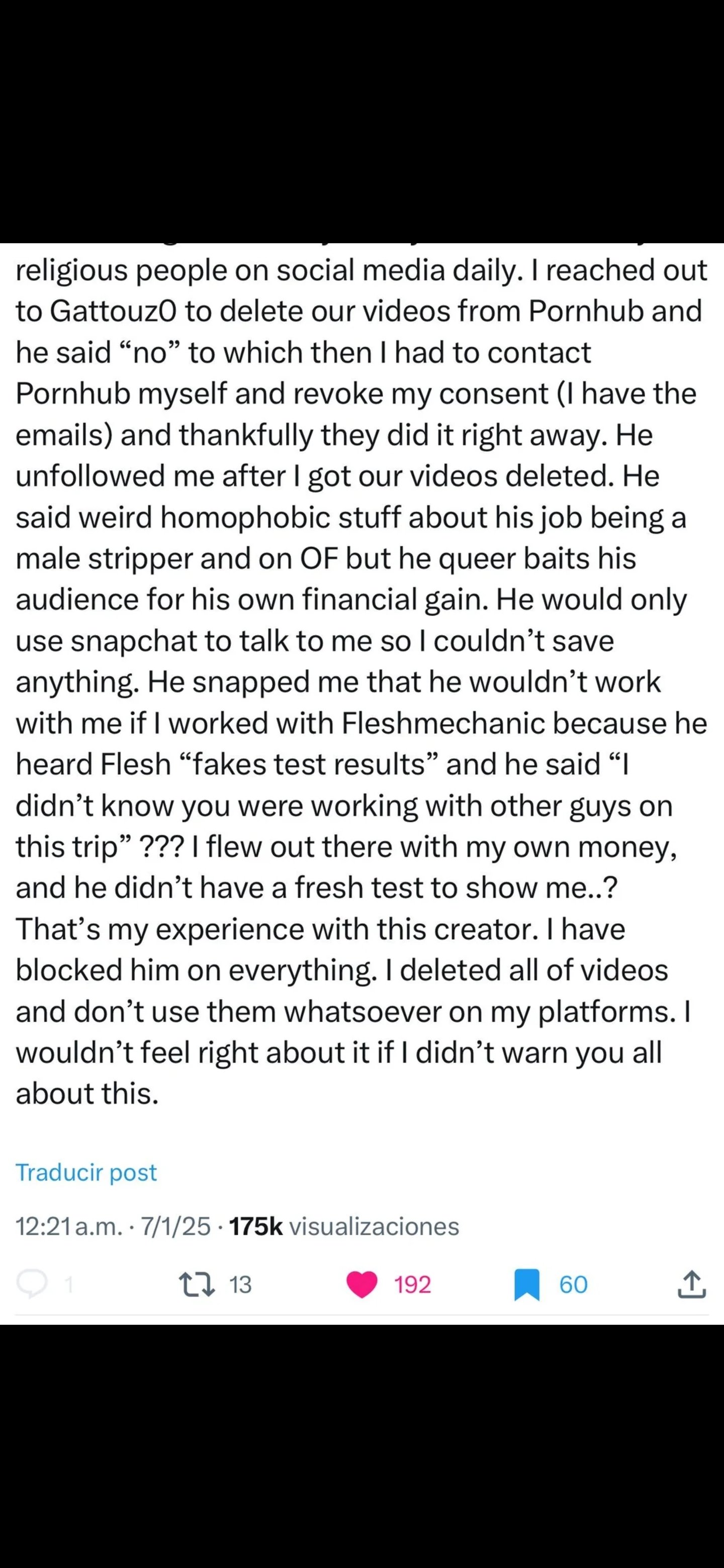 Il m'a unfollow dès que les vidéos ont été supprimées. Il tenait des propos homophobes bizarres sur son métier de strip-teaseur et sur son OF, alors qu'il fait du « queer baiting » auprès de son public pour son propre profit financier. Il ne communiquait avec moi que par Snapchat pour que je ne puisse rien enregistrer. Il m'a envoyé un Snap disant qu'il ne travaillerait plus avec moi si je collaborais avec Fleshmechanic, sous prétexte que ce dernier « falsifierait ses résultats de tests ». Il a aussi ajouté : « Je ne savais pas que tu travaillais avec d'autres mecs pendant ce voyage »... alors que j'ai payé mon propre billet pour venir et qu'il n'avait même pas de test récent à me montrer.