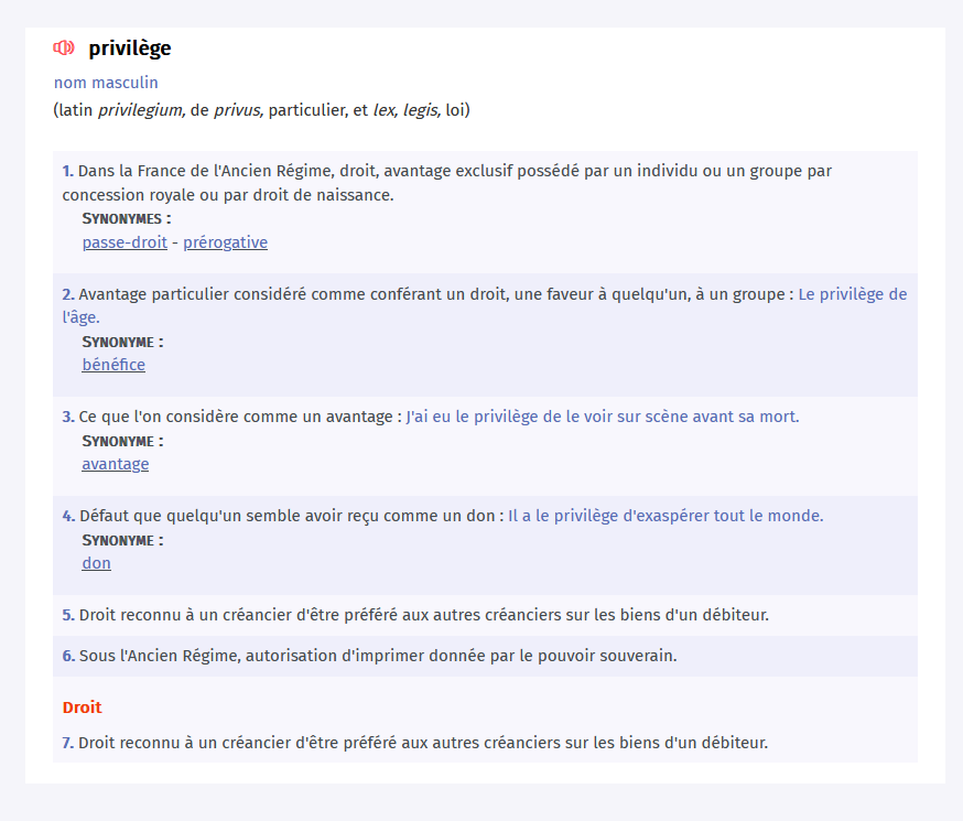 Le mot "privilège", terme dénaturé s'il en est, est je le pense utilisé à tort par certains, et voici pourquoi, par la simple démonstration de l'écrasant sens sémantique unidirectionnel que possèdent toutes les définitions du mot.
