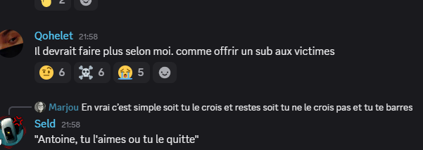 Le discord d'Antoine Daniel est globalement rassuré qu'il ait "seulement" été un gros lourd et potentiellement harceleur de femme en usant de sa notoriété pendant sa vingtaine. (Schéma classique pour un impopulaire au lycée ayant connu par la suite une ascension social fulgurante via youtube : https://youtu.be/4A1P4DquRlM?t=725s )